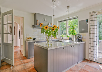 De ruime keuken met eetkamer is verbonden aan de woonkamer middels ensuite deuren. In de ruime woonkeuken treft u een moderne keuken aan, voorzien van alle gemakken, zoals inductiekookplaat, afzuigkap, vaatwasser, oven, magnetron, koelkast, veel kastruimte en een fraai natuurstenen blad. Door de raampartijen en tuindeuren kunt u vanuit deze ruimte optimaal genieten van de tuin.