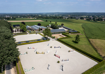 Tegenover de rijhal ligt in de lengte de overdekte longeercirkel (ca. 16x16m) voorzien van een Eb & Vloed bodem uit 2018. Aan de achterzijde van de hal liggen de 6 merrie met veulenstallen in totaal ca. 6x5m. De gemetselde stallen zijn voorzien van automatische drinkbakken met circulatiesysteem en voerbakken. Het dak is geïsoleerd en voorzien van een lichtstraat. Achter de hal ligt de overdekte 4-paards trainingsmolen met bouwjaar 2012 en in 2018 overdekt. De trainingsmolen is omringd met conifeer.