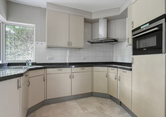De keuken is opgesteld in een praktische U-vorm en uitgerust met moderne inbouwapparatuur. Vanuit hier kijkt u uit over de oprijlaan.
