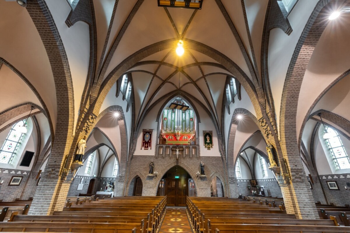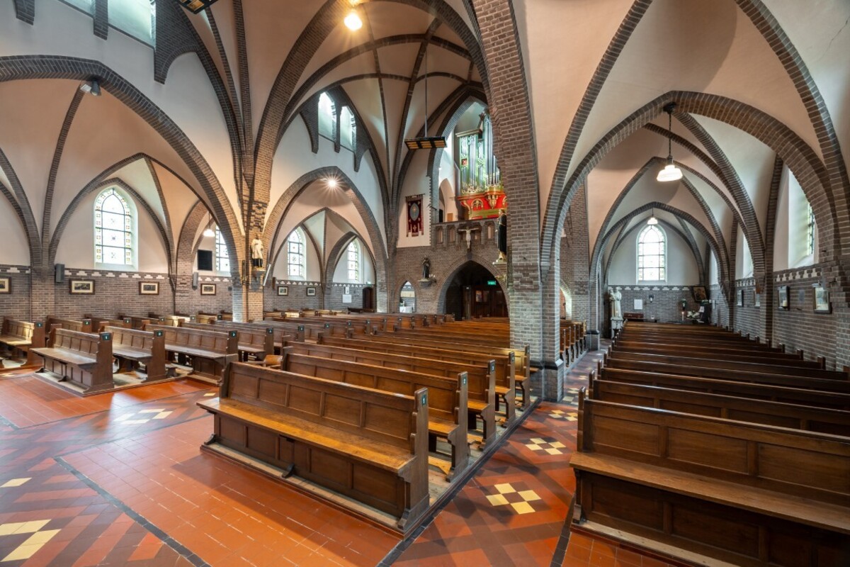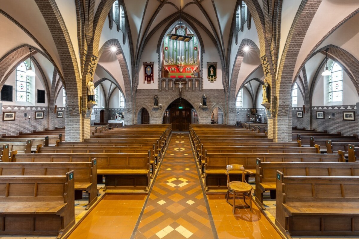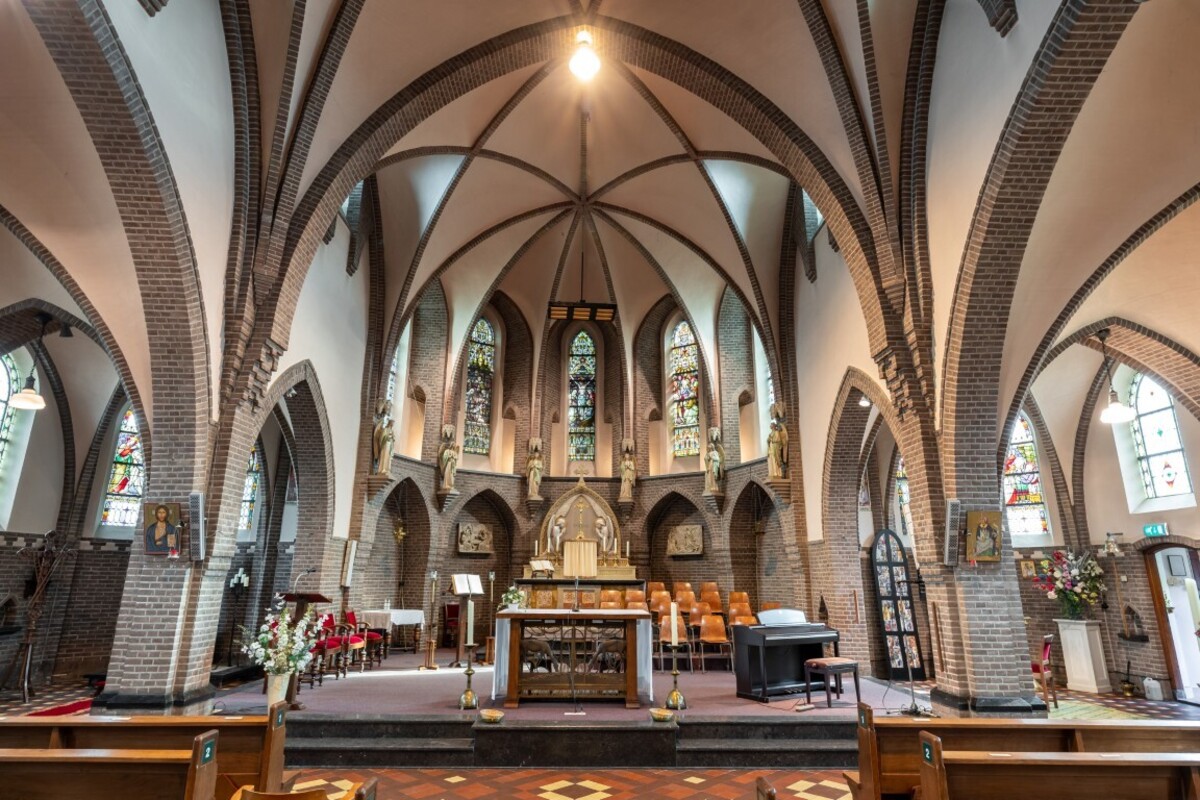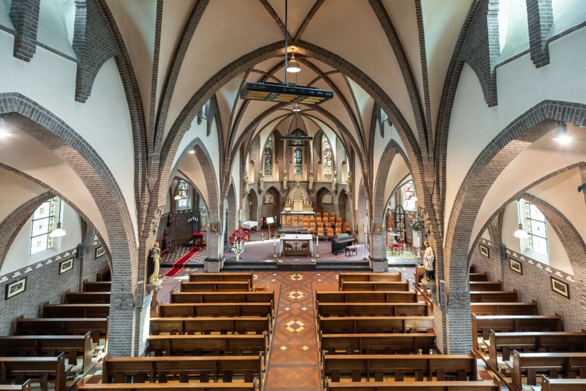Narthex, toren met zangkoor, schip met zijbeuken, viering / priesterkoor met koorsluiting apsis), transept, sacristie, parochiezaal met sanitaire voorziening en keukenblok, kantoorkamer, entree met portaal, cv-ruimte.