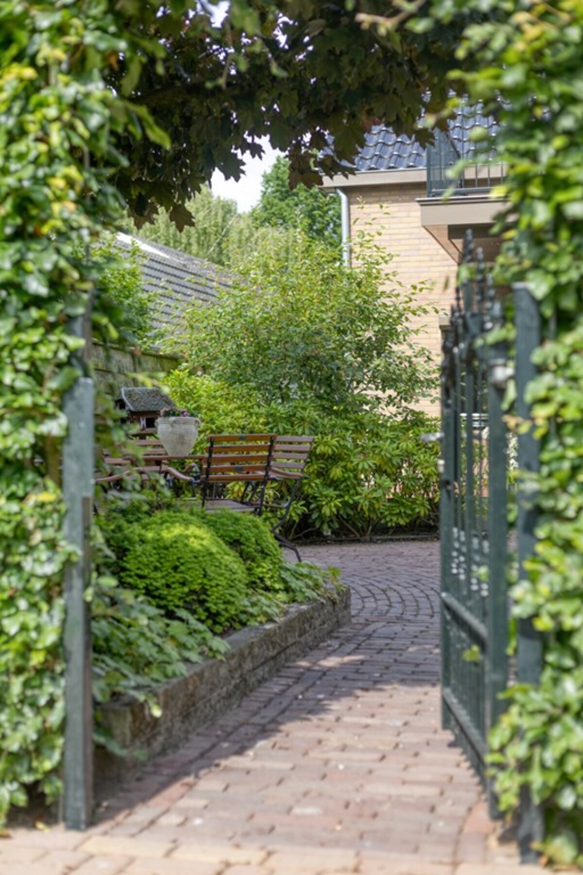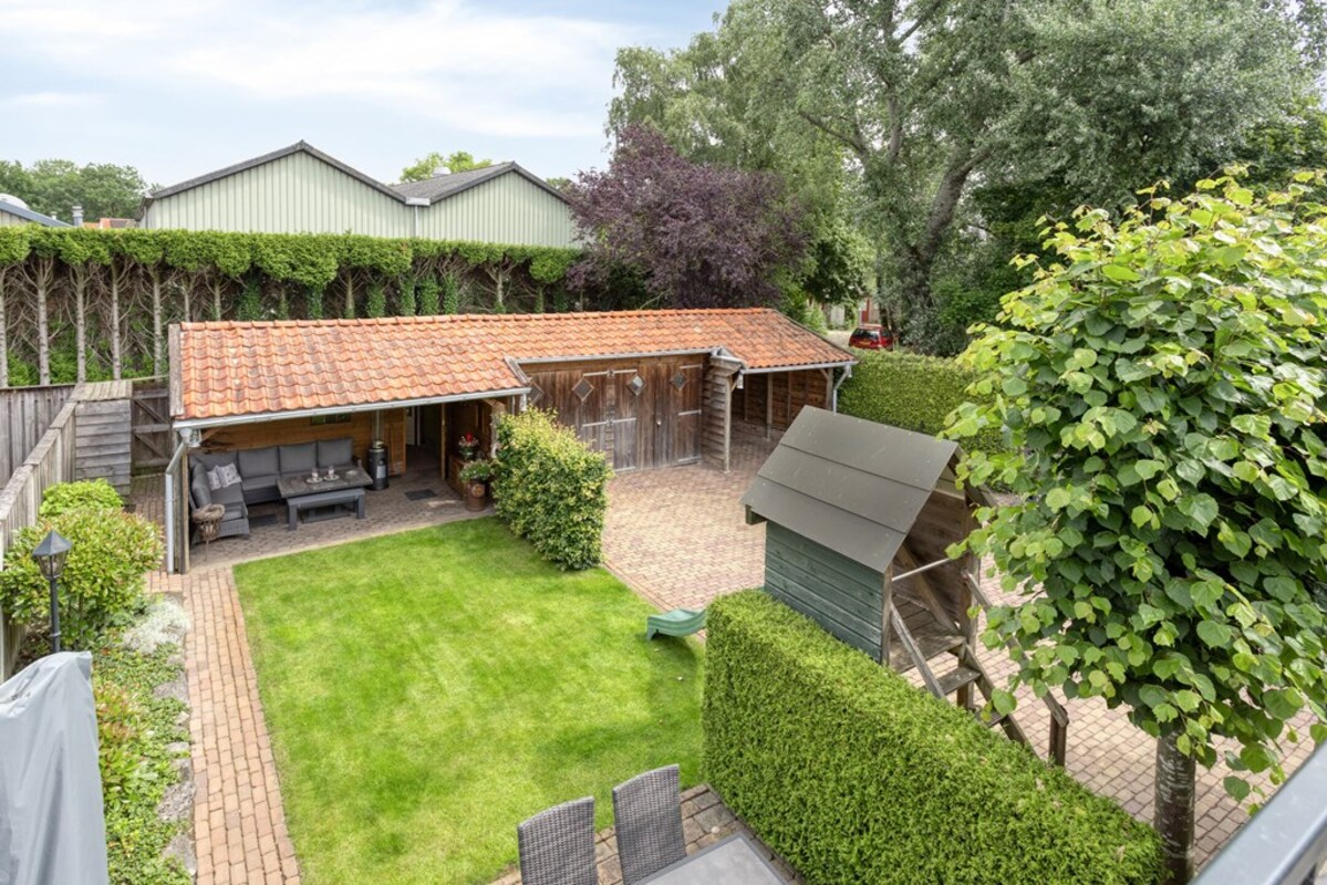 Een romantisch doorkijkje leidt naar een knus terras - een ideale plek voor een kop koffie in de ochtendzon. Onder de veranda geniet je heerlijk van lange avonden. Elke hoek van de tuin kun je verder naar eigen wens optimaal benutten. Enerzijds is een groot gedeelte praktisch bestraat; aan de andere kant kunnen de kinderen heerlijk gebruikmaken van de grote tuin met het mooie gazon.