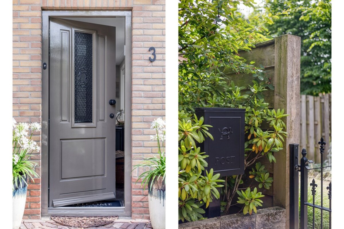 Het handige pad aan de achterzijde van de woning is in eigendom. De zijkant van het perceel is toegankelijk via een brede automatische poort. Over de hele linie is sierhekwerk toegepast.
