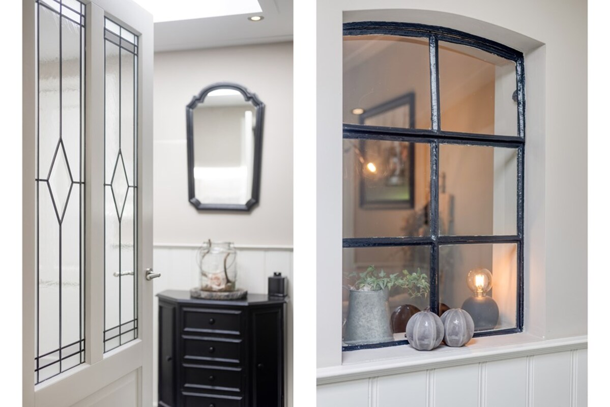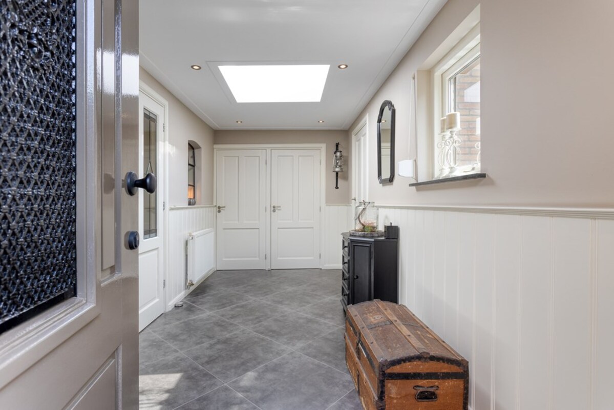 Door de prachtige voordeur stap je al binnen in een royale entree. Wat direct opvalt is de aanwezigheid van de daglichtkoepel. De begane grond is voorzien van plavuizen en pvc-vloer.