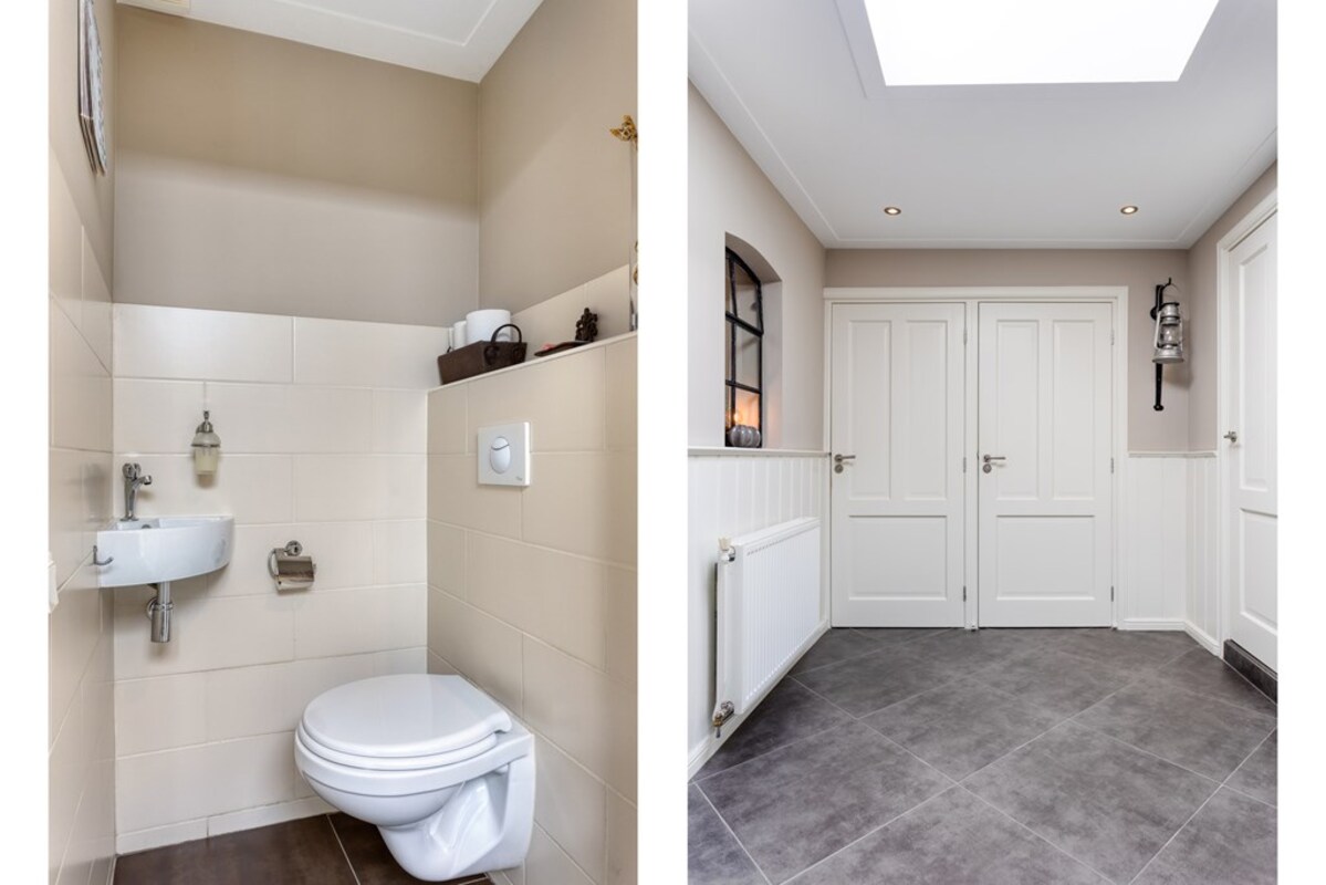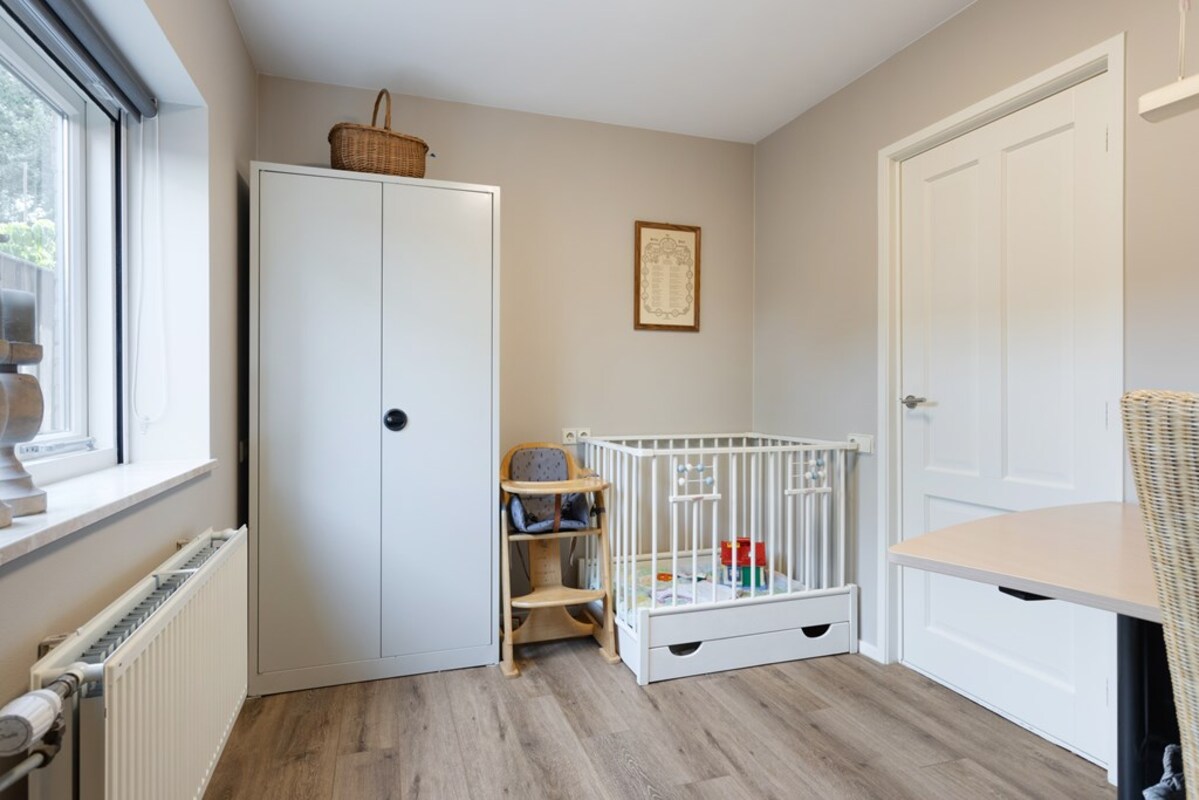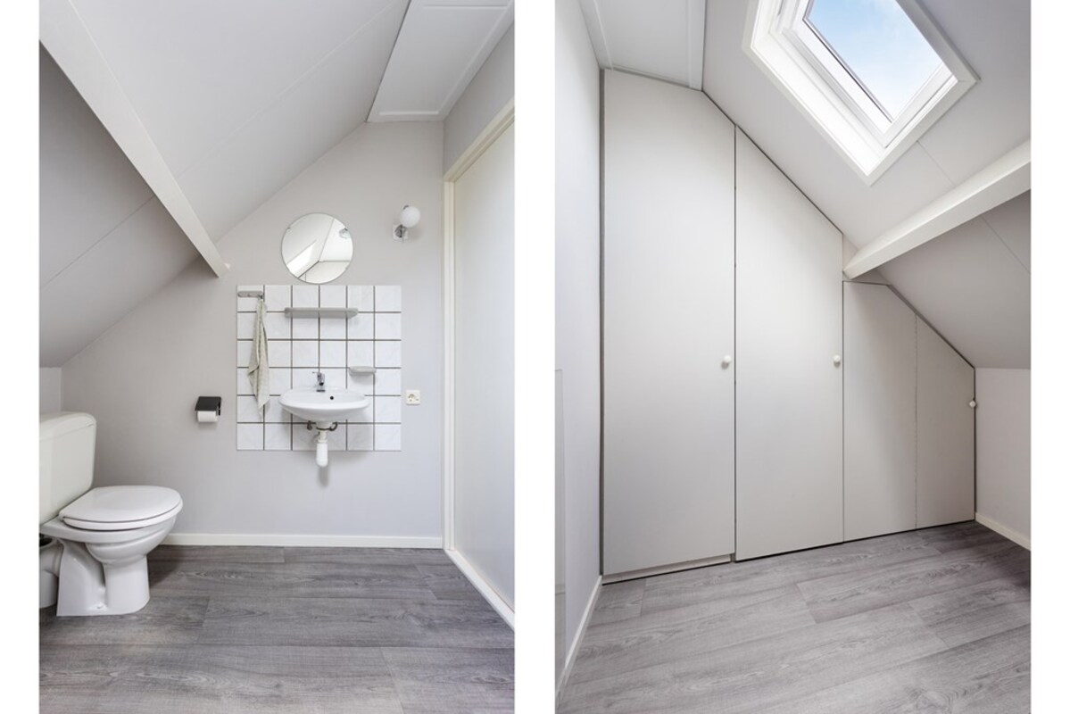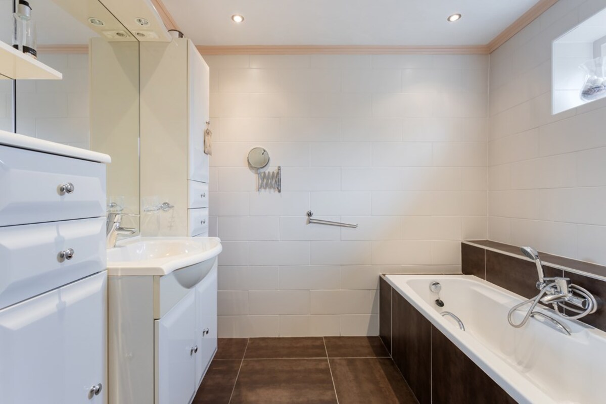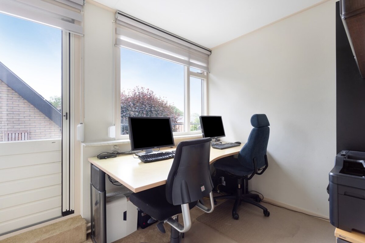 Op de benedenverdieping is ook een (slaap-)kamer annex kantoorruimte, een separaat toilet en badkamer gesitueerd. De badkamer is voorzien van een douche, bad, badkamermeubel en radiator en heeft een warme uitstraling.