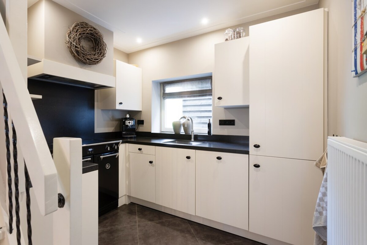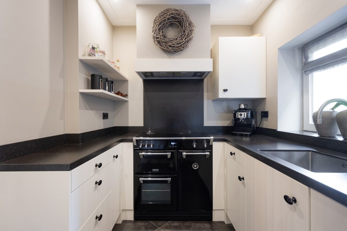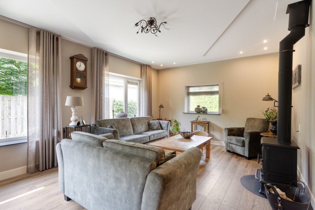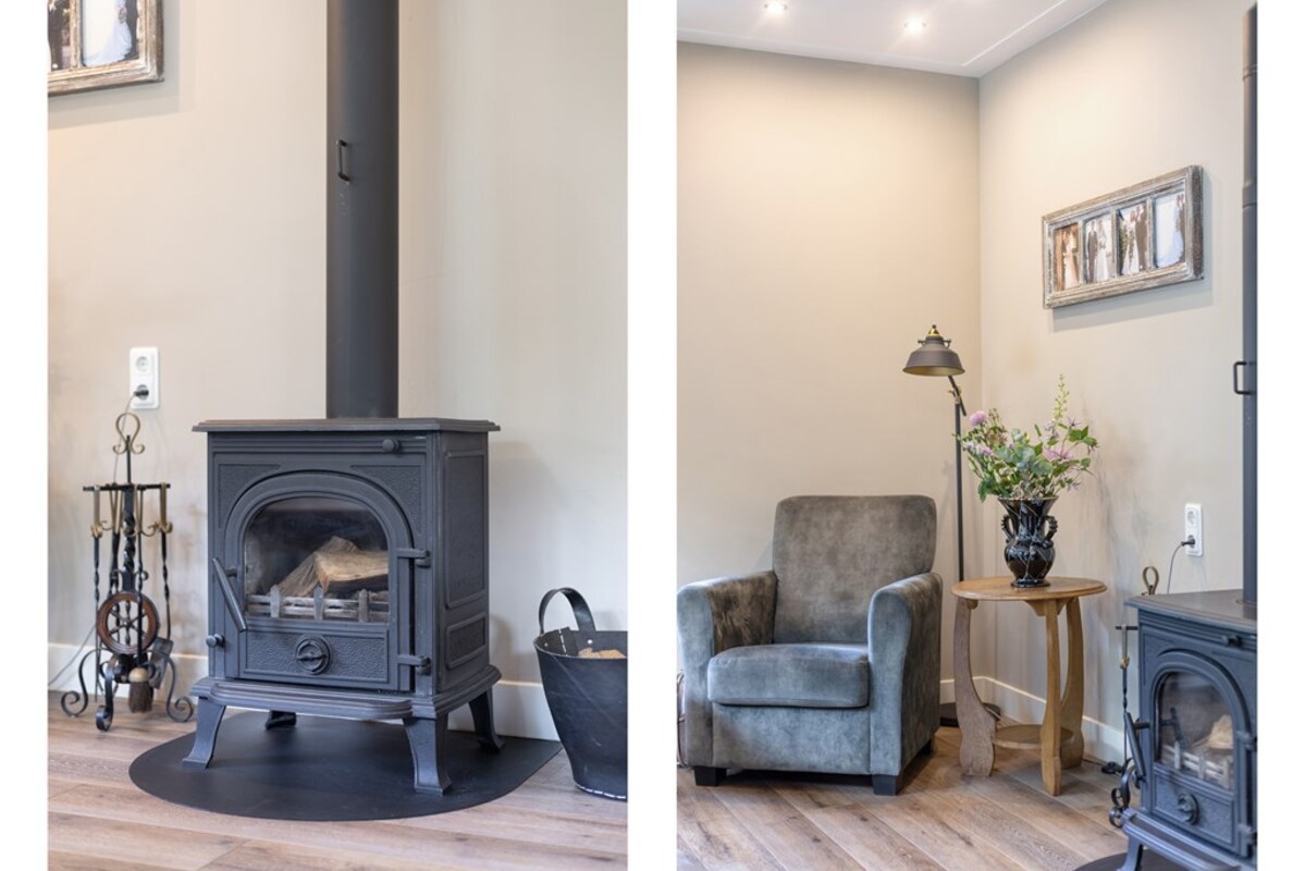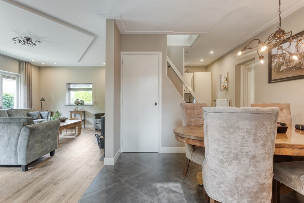 Via de hal heb je toegang tot de woon-/ eetkamer met open keuken en trapopgang. De woonkamer heeft veel lichtinval en leent zich voor een gezellige indeling met diverse hoekjes. De houtkachel versterkt dit knusse gevoel. De ruimtes zijn strak afgewerkt met stucwerk. De blikvanger in de keuken is wel het Richmond inductiefornuis.