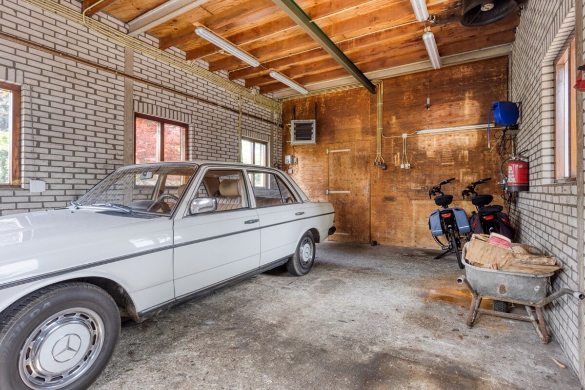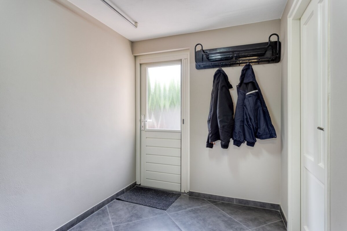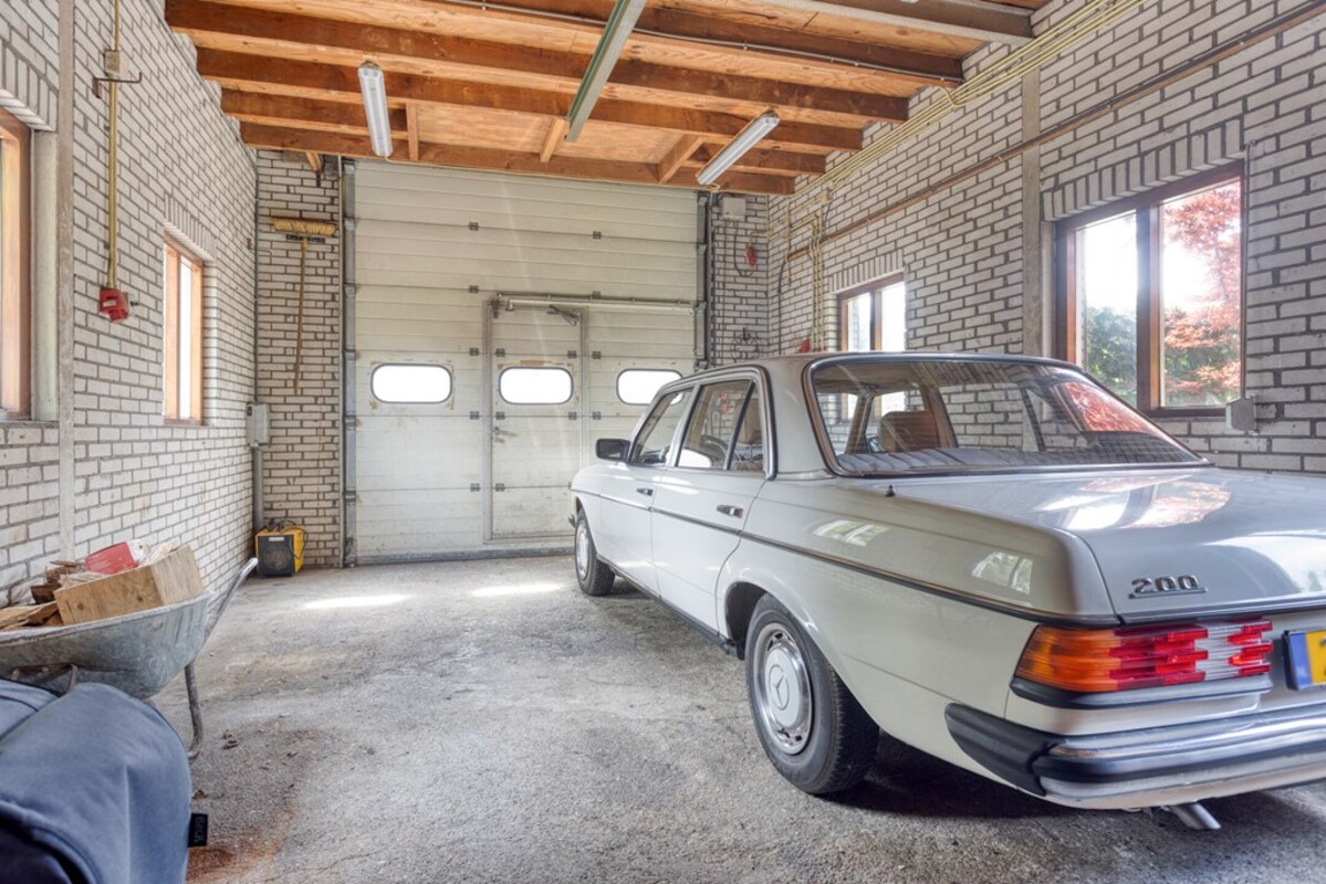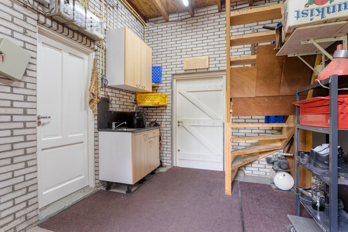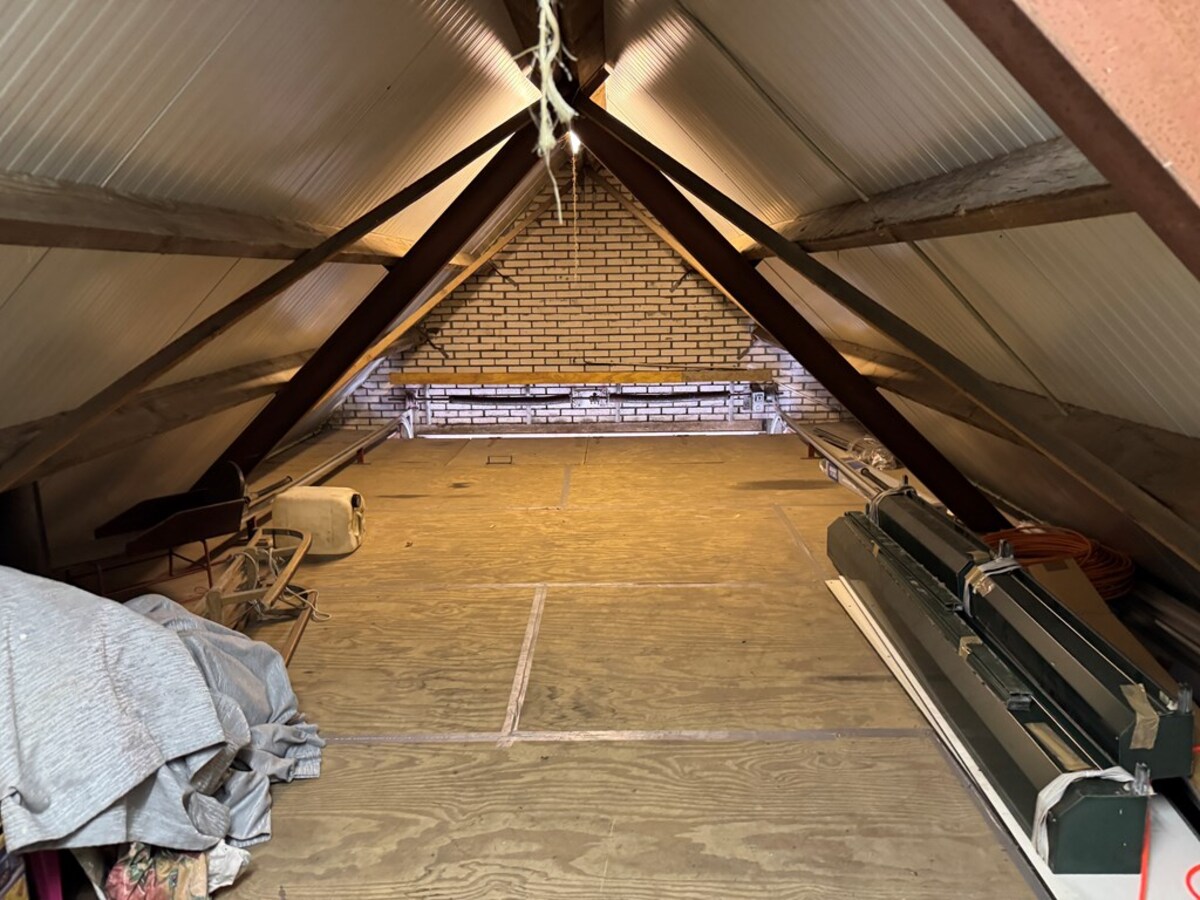 De bijkeuken is ruim opgezet met kastenwand en doet dienst als wasruimte. Via de bijkeuken is de garage binnendoor bereikbaar. De prachtige bergzolder is met een vaste trap bereikbaar. De garage met betonvloer biedt ruim plaats aan één auto. Deze royale ruimte is tevens voorzien van water, krachtstroom (3 x 25 ampère aansluiting) en een overheaddeur. Op het dak van de garage liggen 18 zonnepanelen!