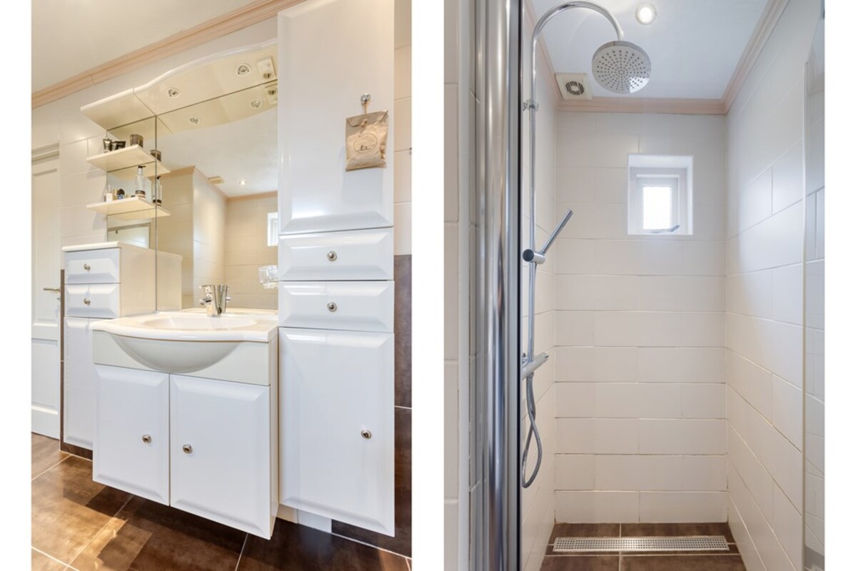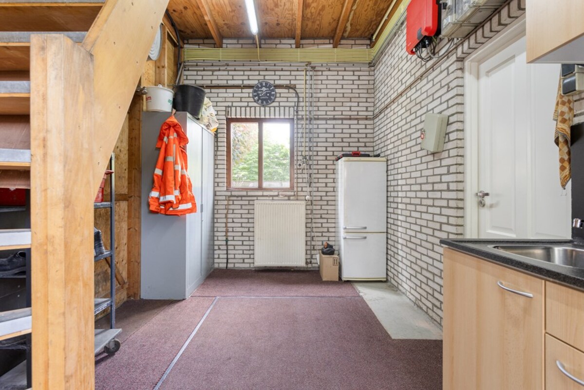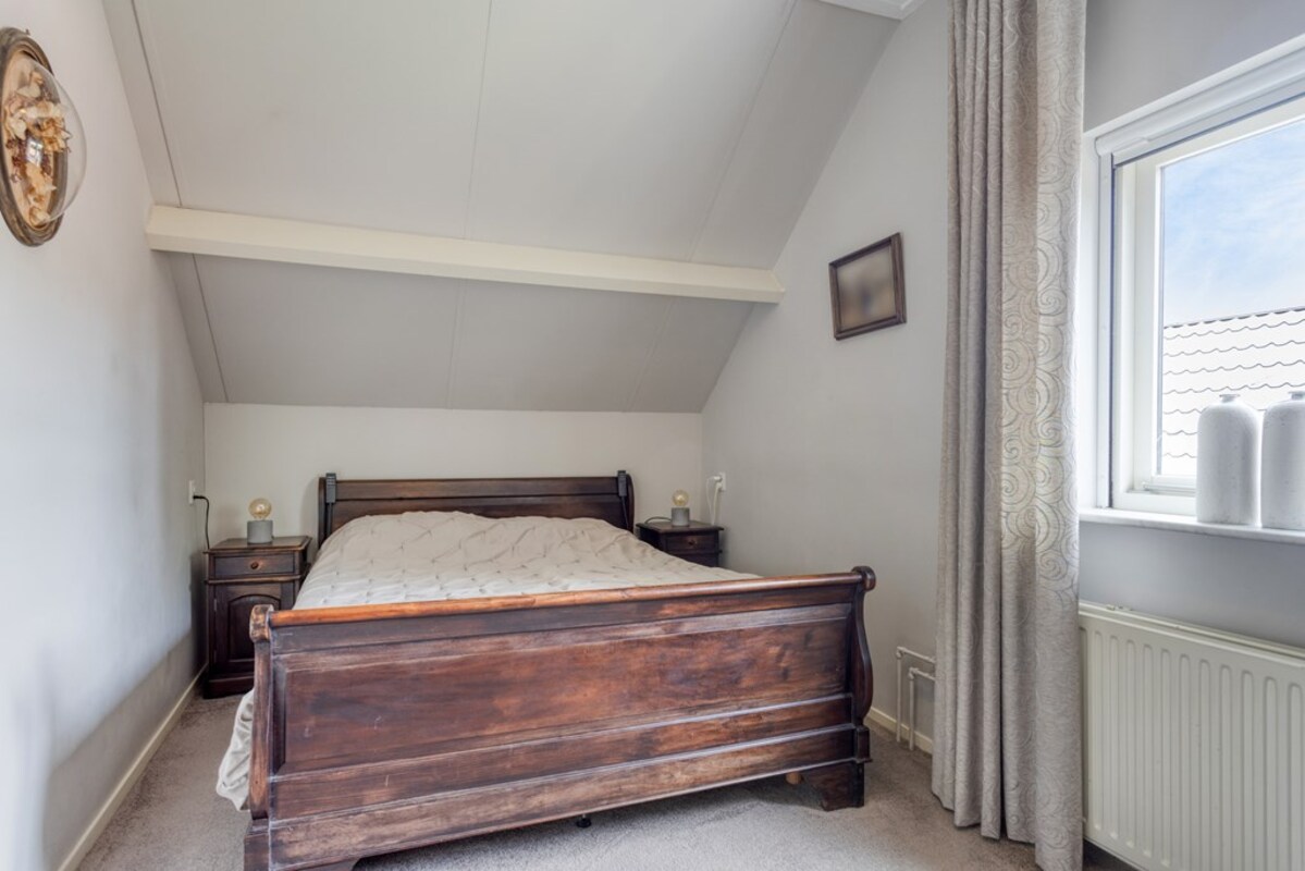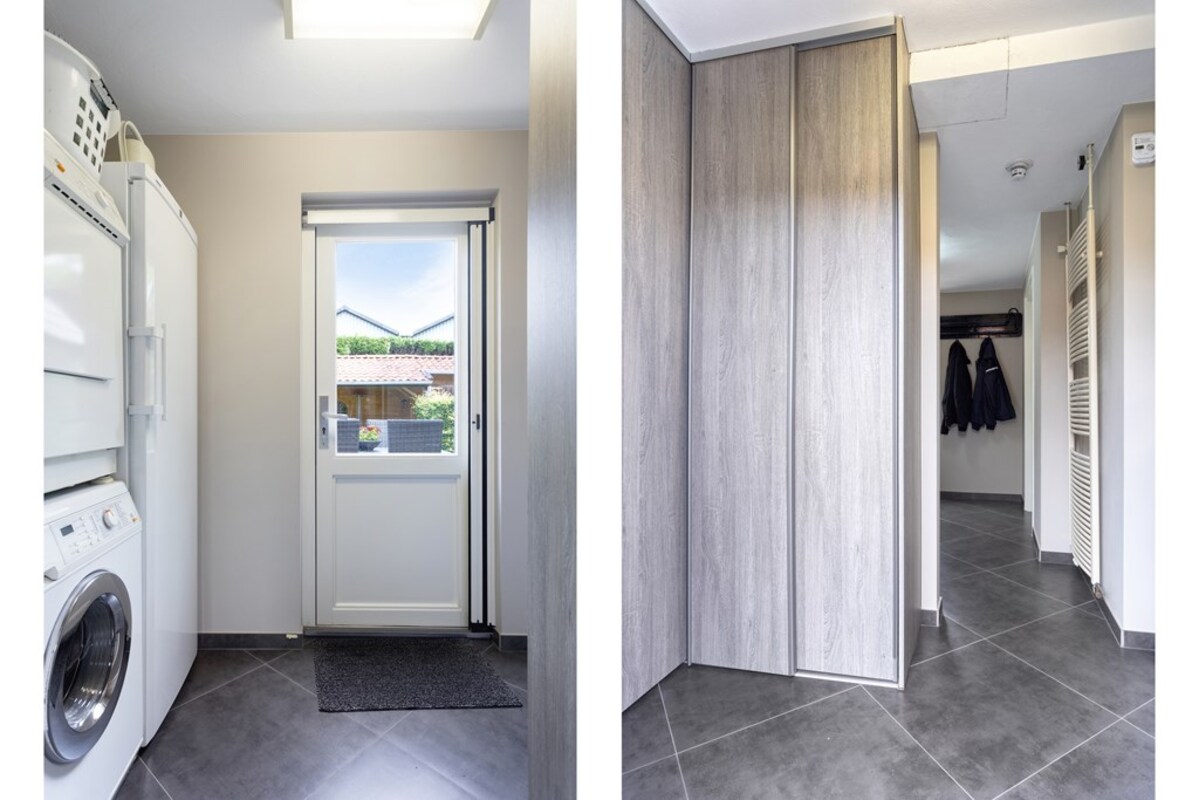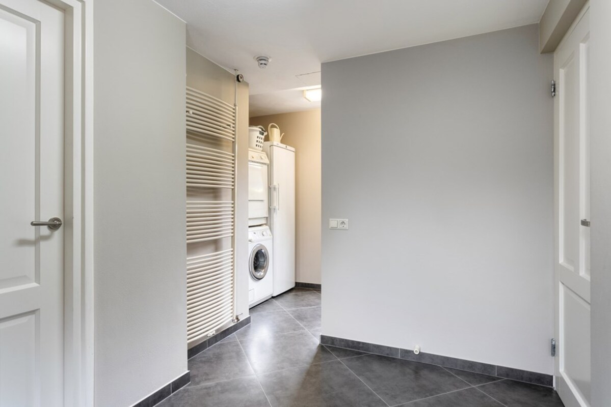 De bijkeuken is ruim opgezet met kastenwand en doet dienst als wasruimte. Via de bijkeuken is de garage binnendoor bereikbaar. De prachtige bergzolder is met een vaste trap bereikbaar. De garage met betonvloer biedt ruim plaats aan één auto. Deze royale ruimte is tevens voorzien van water, krachtstroom (3 x 25 ampère aansluiting) en een overheaddeur. Op het dak van de garage liggen 18 zonnepanelen!
