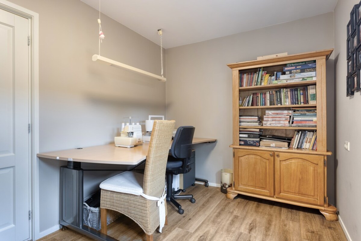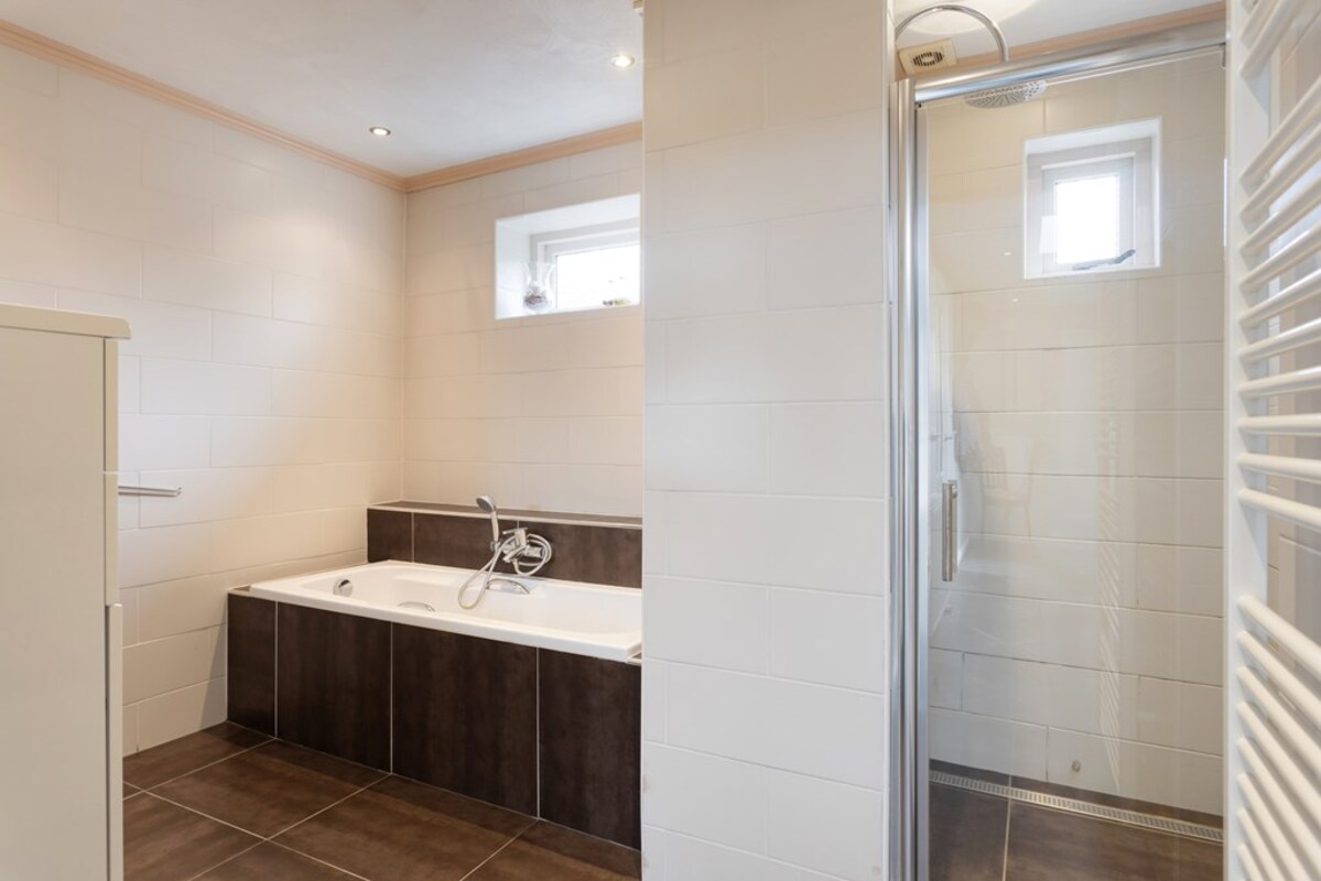 Op de benedenverdieping is ook een (slaap-)kamer annex kantoorruimte, een separaat toilet en badkamer gesitueerd. De badkamer is voorzien van een douche, bad, badkamermeubel en radiator en heeft een warme uitstraling.