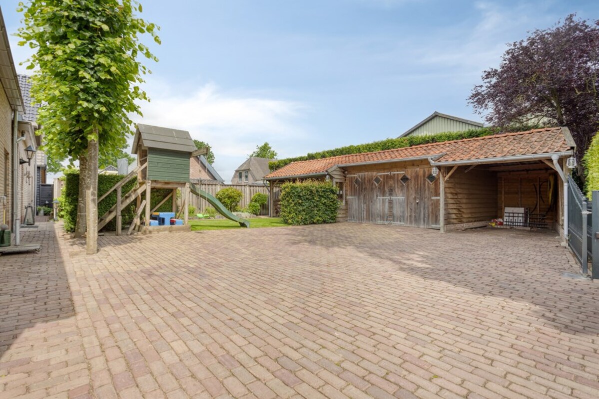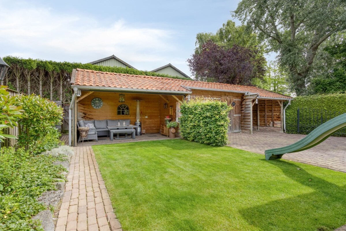 De in boerderijstijl afgewerkte overkapping met kunststof dakgoten is in de volle breedte van de tuin doorgetrokken en biedt daarmee ook plaats aan meerdere werktuigen, overige opslag of is te gebruiken als hobbyruimte.