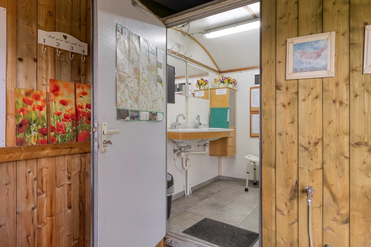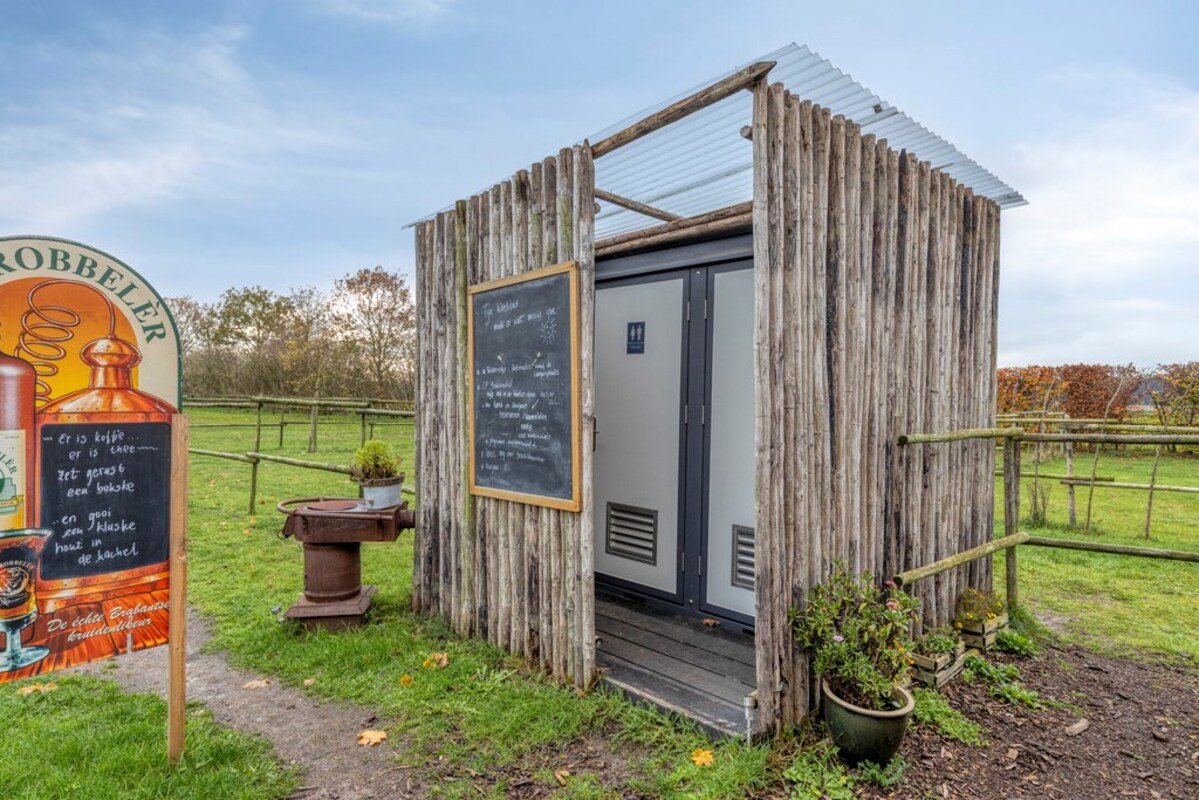 Aan de achterzijde ligt de, met groen omzoomde, kleinschalige camperplaats, ingericht met een toiletgebouw, een gezellig, overdekt en volledig af te sluiten terras met doucheruimte en een vijver.