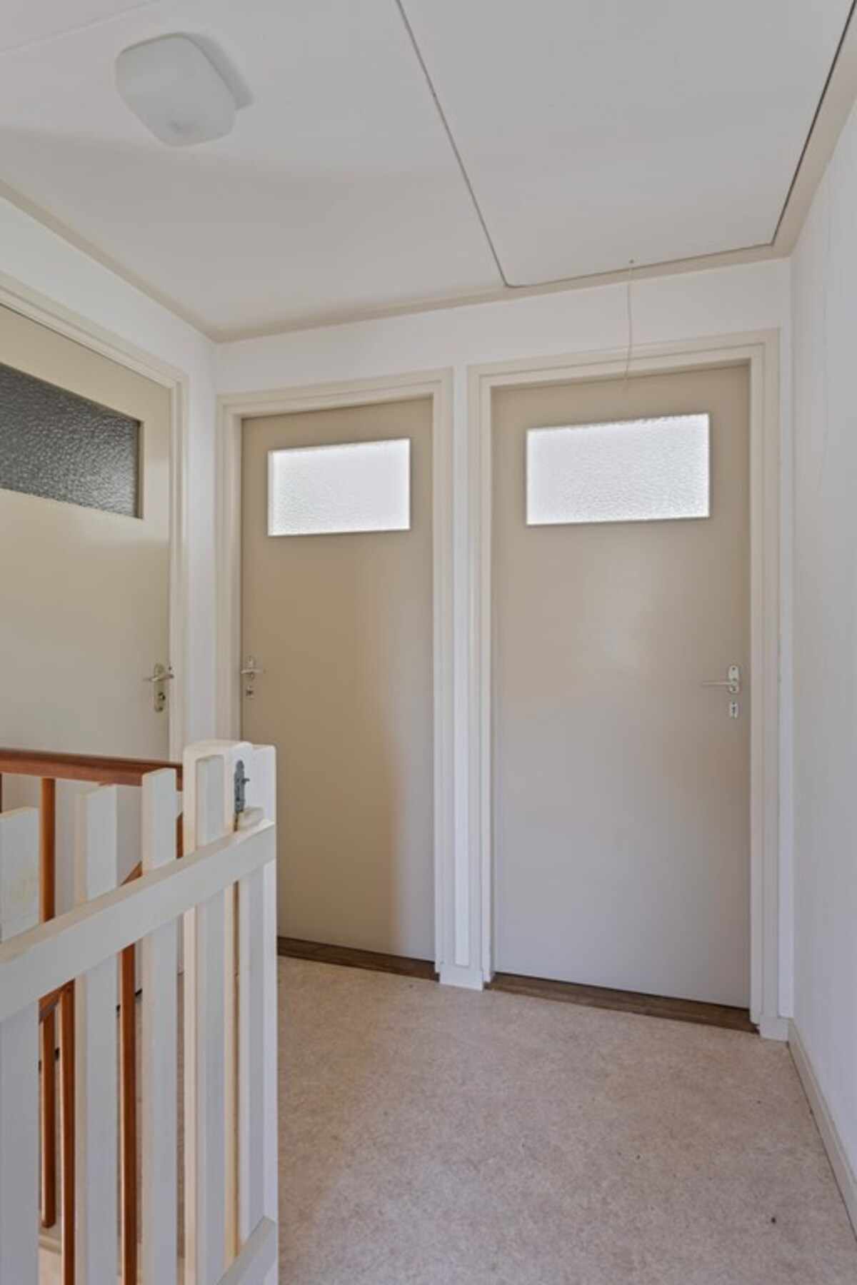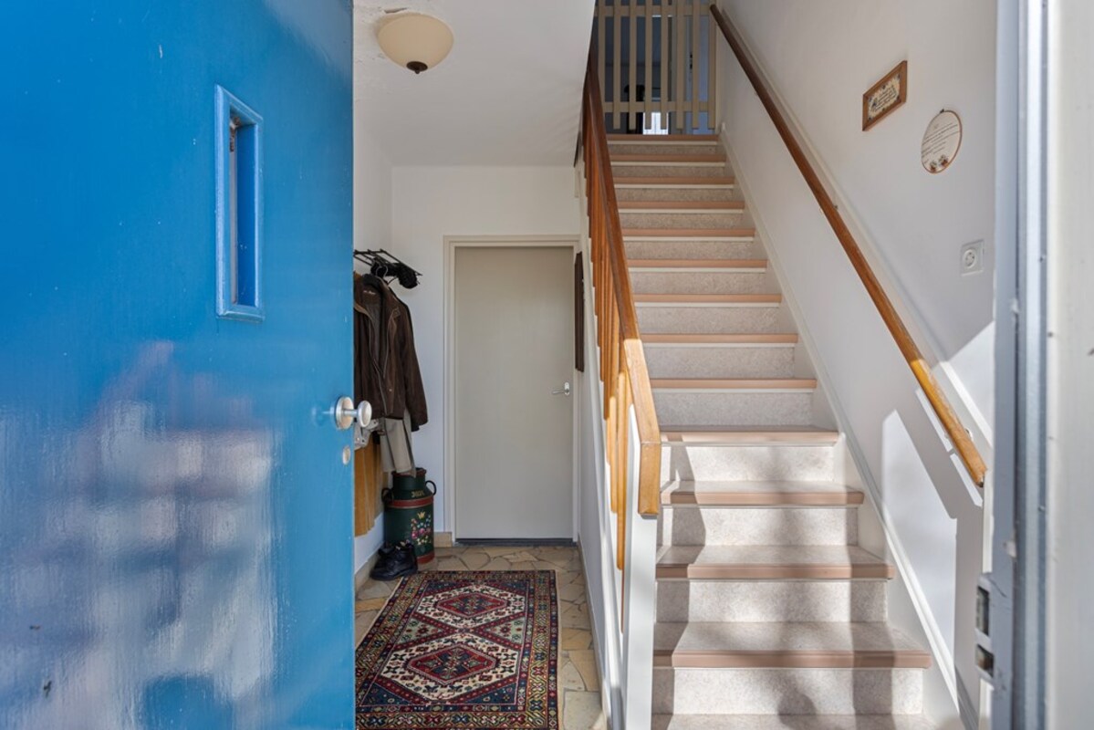 De trap in de hal leidt naar de overloop op de eerste verdieping, die toegang geeft tot vier slaapkamers en een toilet. Eén van de slaapkamers beschikt over een eigen wastafel en alle kamers hebben vaste kasten. De gehele verdieping is voorzien van zeil, terwijl het toilet een tegelvloer heeft. Op de overloop bevindt zich een luik naar de bergzolder.