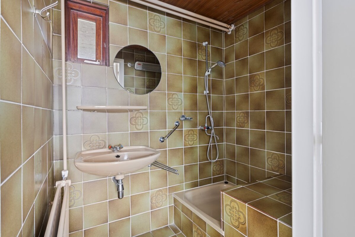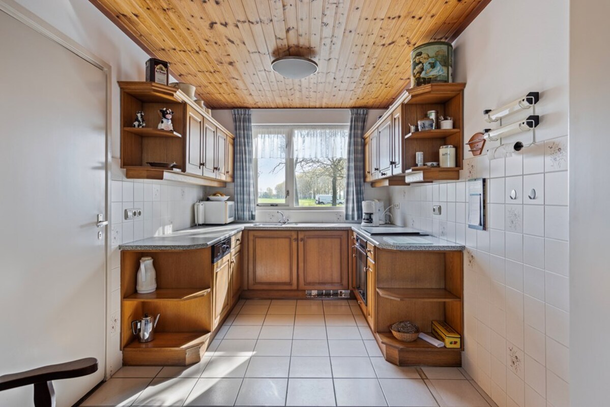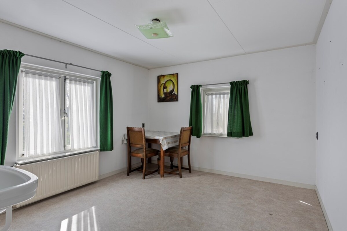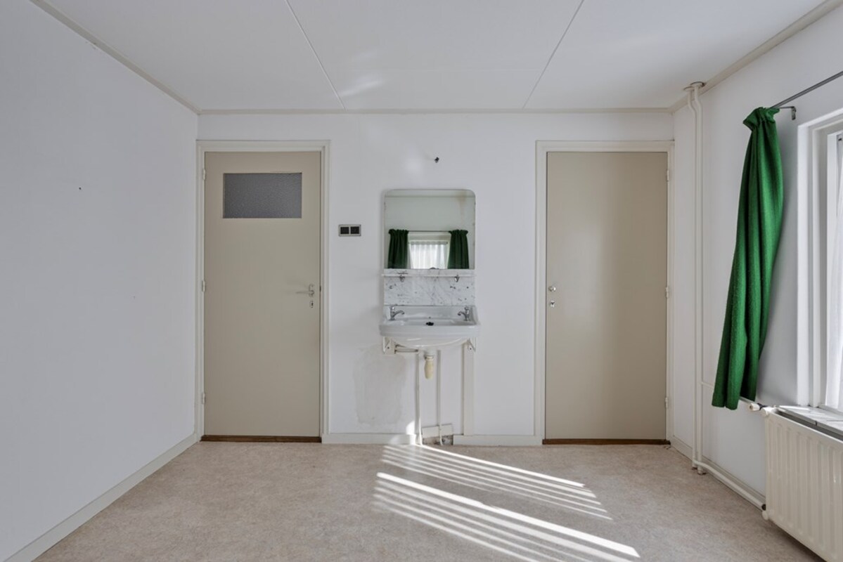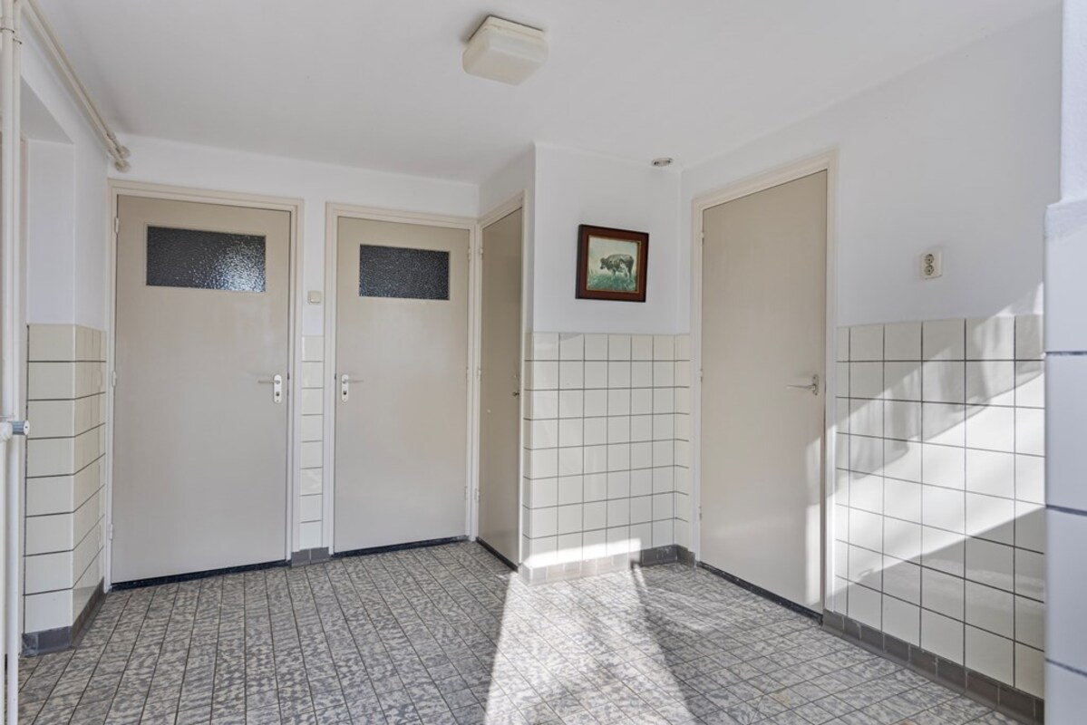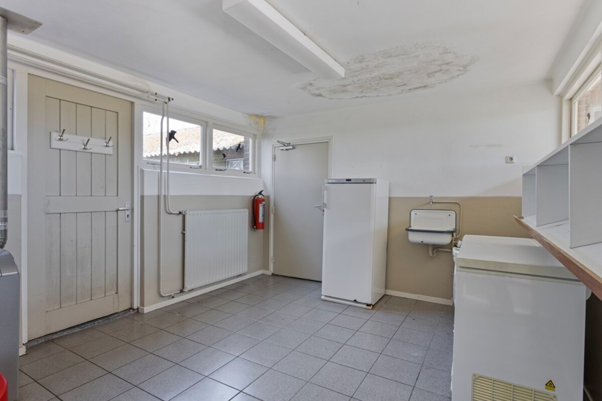 Via de keuken kom je in de ruime achterbouw, waar zich het toilet, een douche met wastafel en extra kastruimte bevinden. Aansluitend bevindt zich de bijkeuken met aansluitingen voor witgoed en de c.v.-opstelling. Vanuit de achterbouw is er toegang tot de voormalige rundveestal.