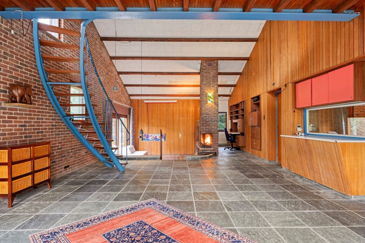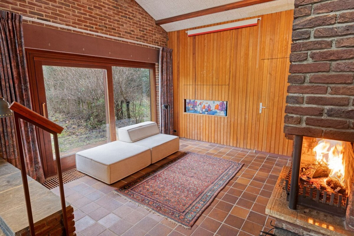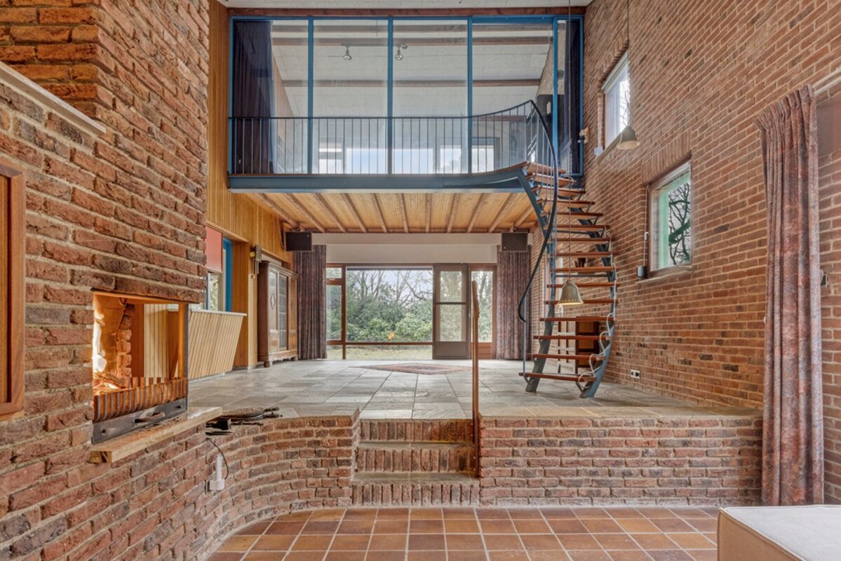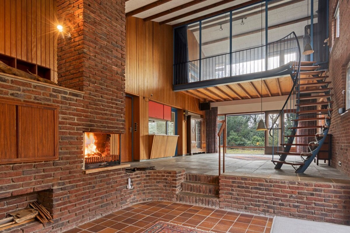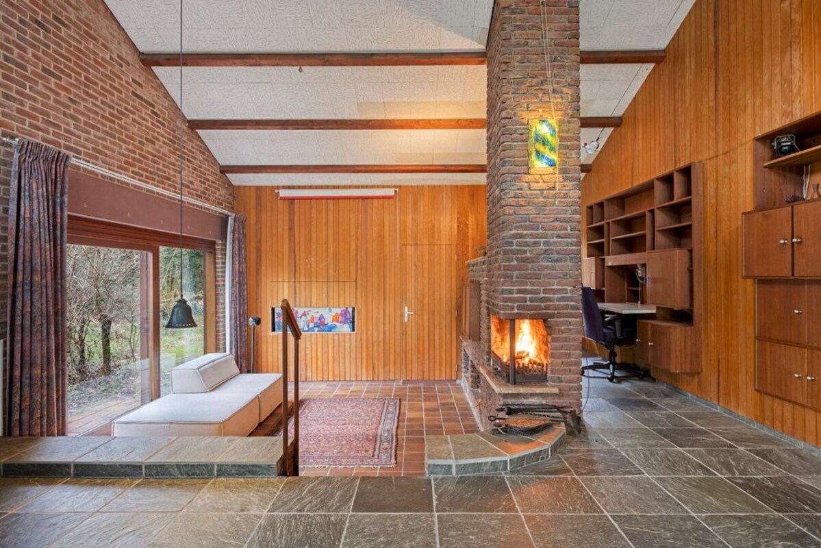 De woonkamer is bijzonder ruim en licht, met een indrukwekkende hoogte en grote raampartijen. De combinatie van hout, natuursteen en schoonmetselwerk geeft deze ruimte een karaktervolle uitstraling. De sfeervolle zitkuil met openhaard vormt het warme hart van de leefruimte en nodigt uit tot ontspanning. Dankzij de open opzet en het lichtinval zijn hier tal van indelingsmogelijkheden denkbaar.