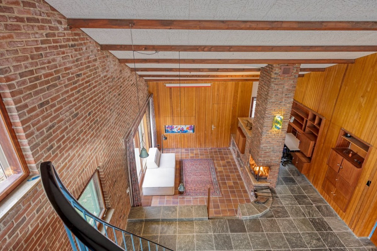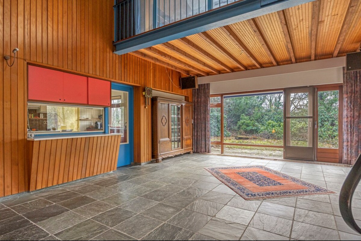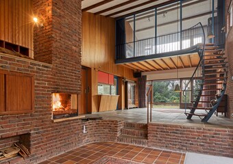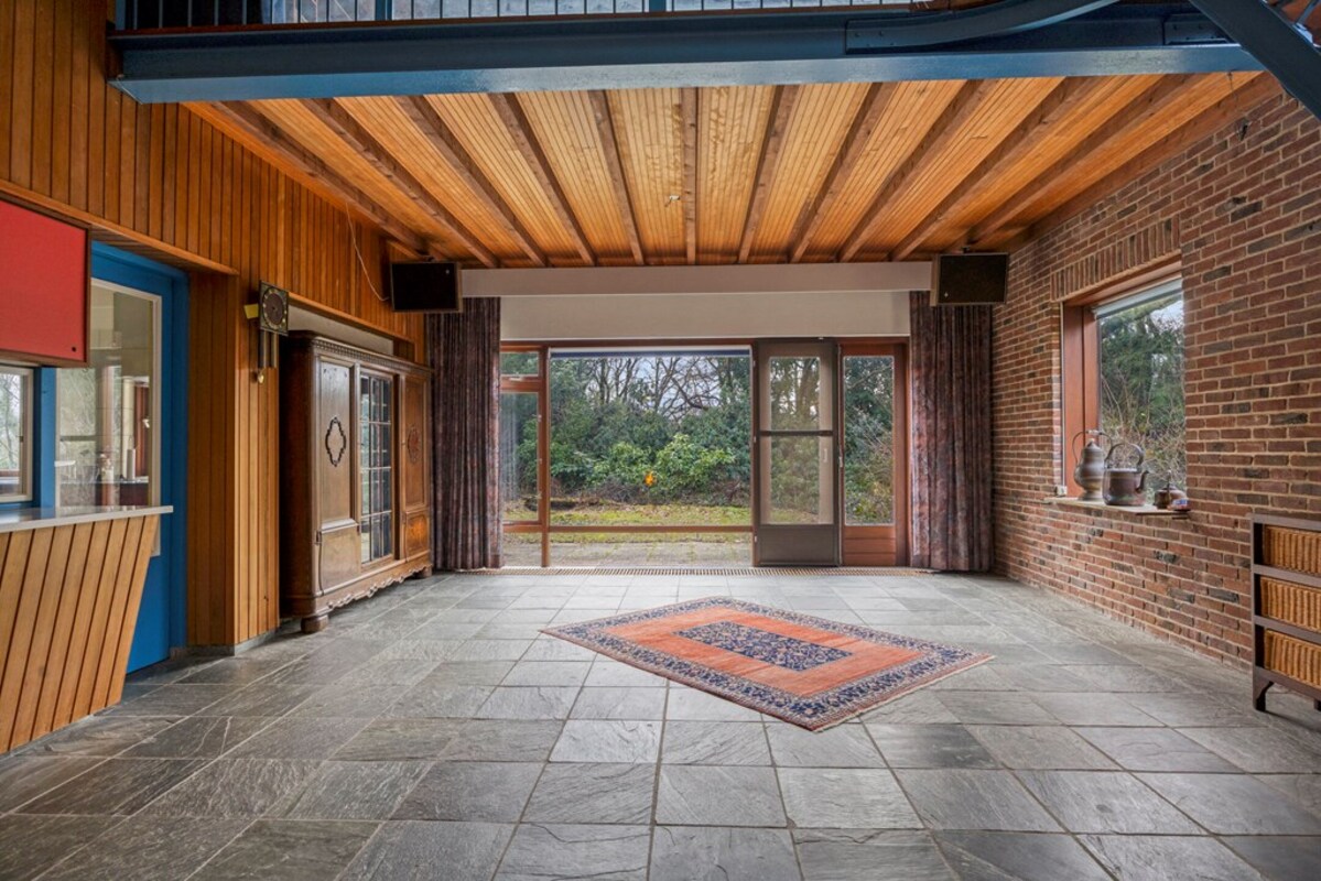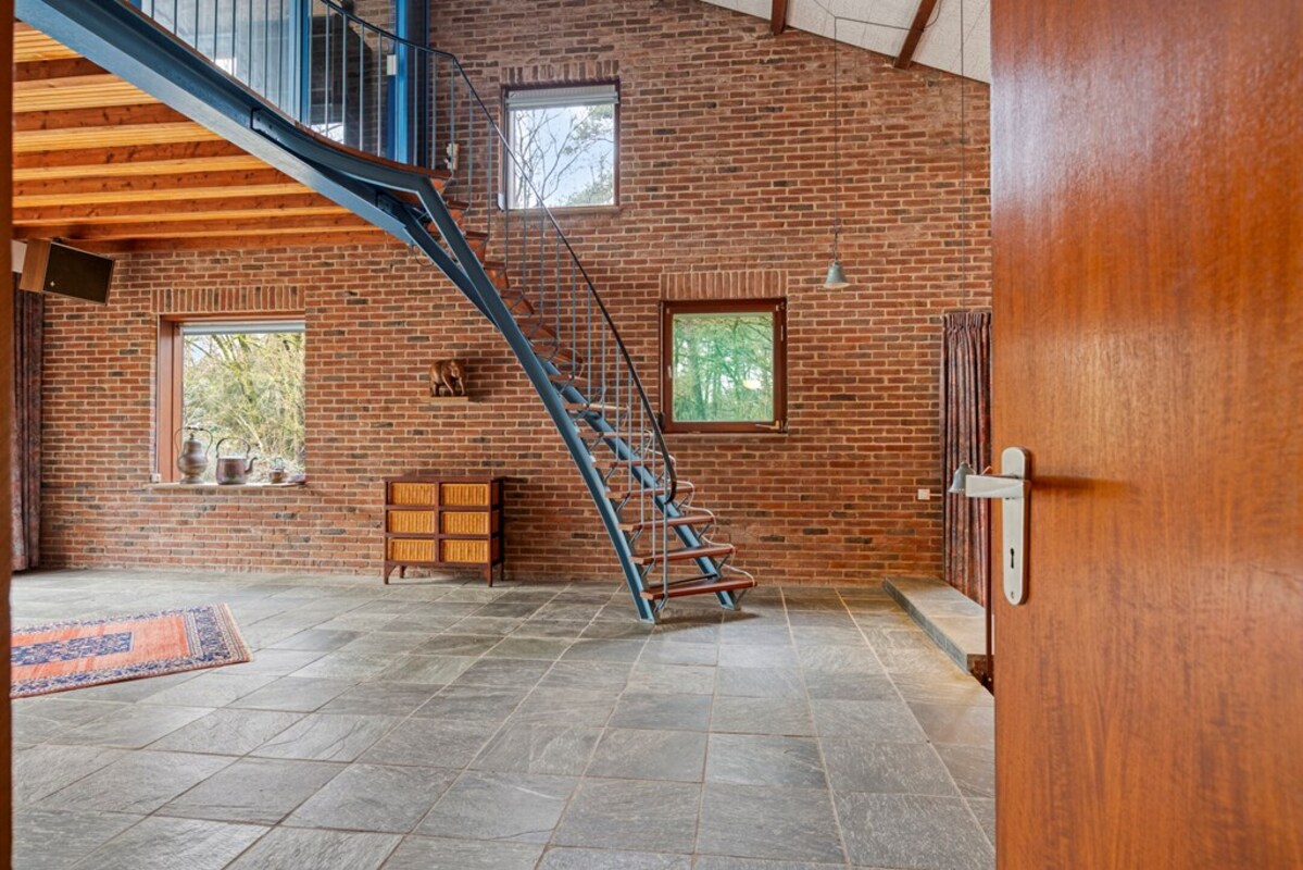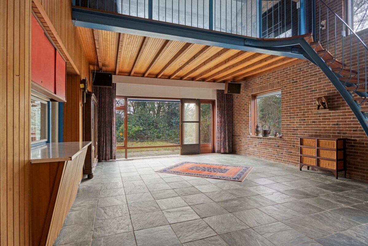 De woonkamer is bijzonder ruim en licht, met een indrukwekkende hoogte en grote raampartijen. De combinatie van hout, natuursteen en schoonmetselwerk geeft deze ruimte een karaktervolle uitstraling. De sfeervolle zitkuil met openhaard vormt het warme hart van de leefruimte en nodigt uit tot ontspanning. Dankzij de open opzet en het lichtinval zijn hier tal van indelingsmogelijkheden denkbaar.