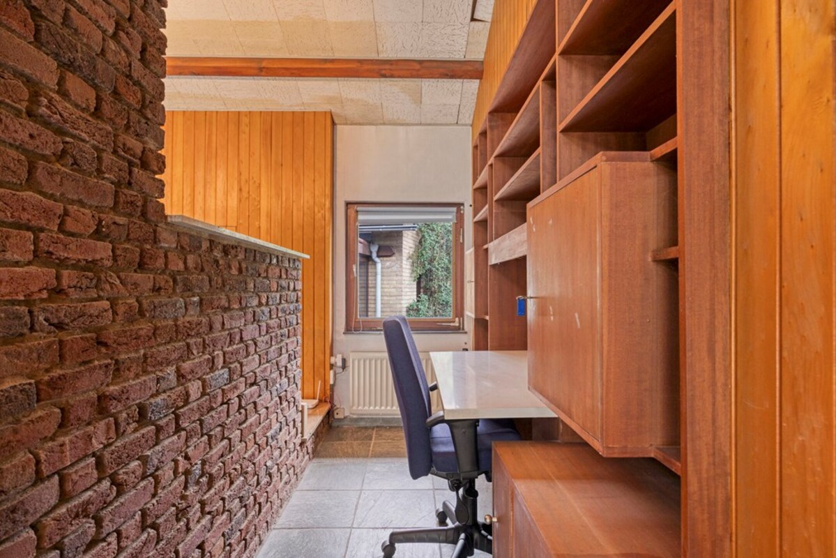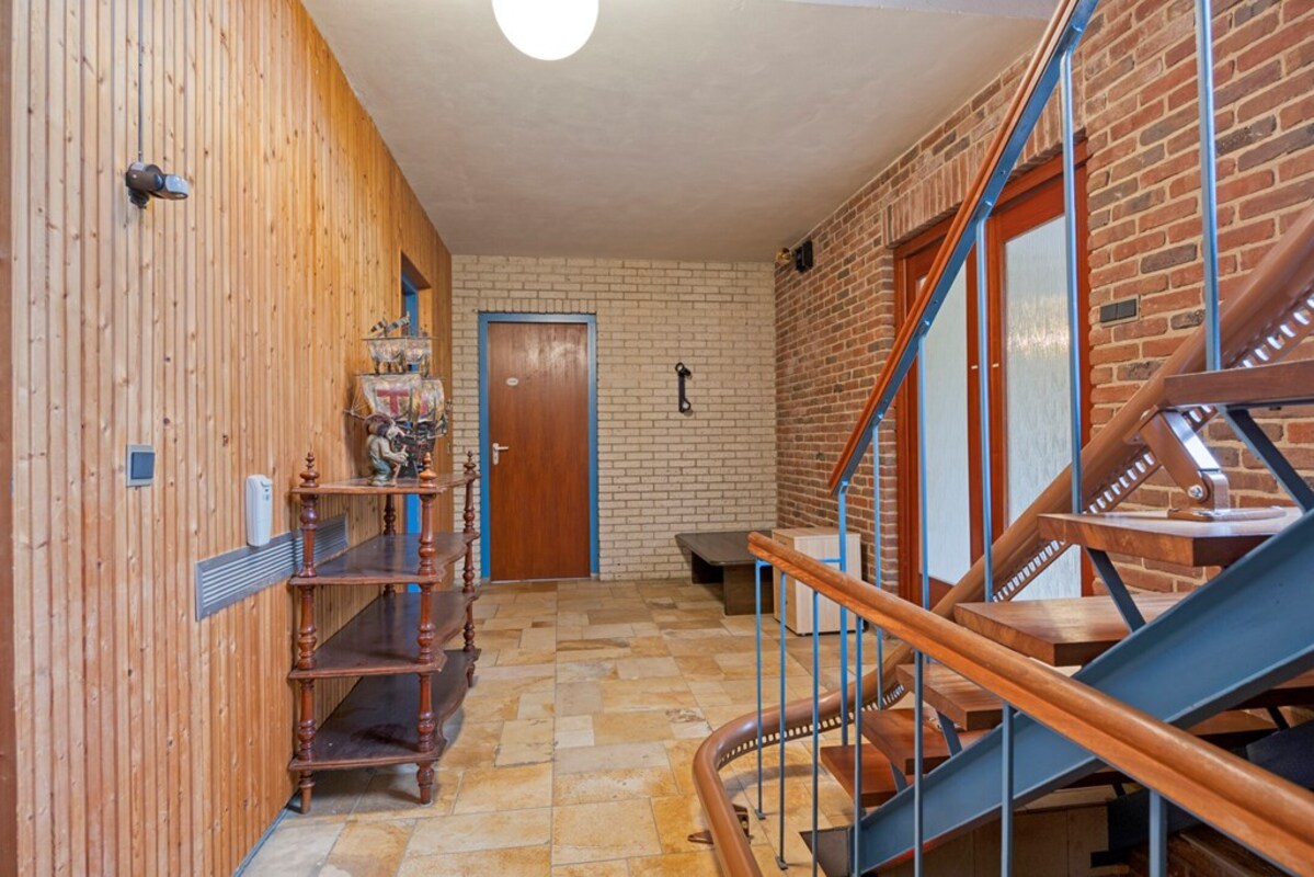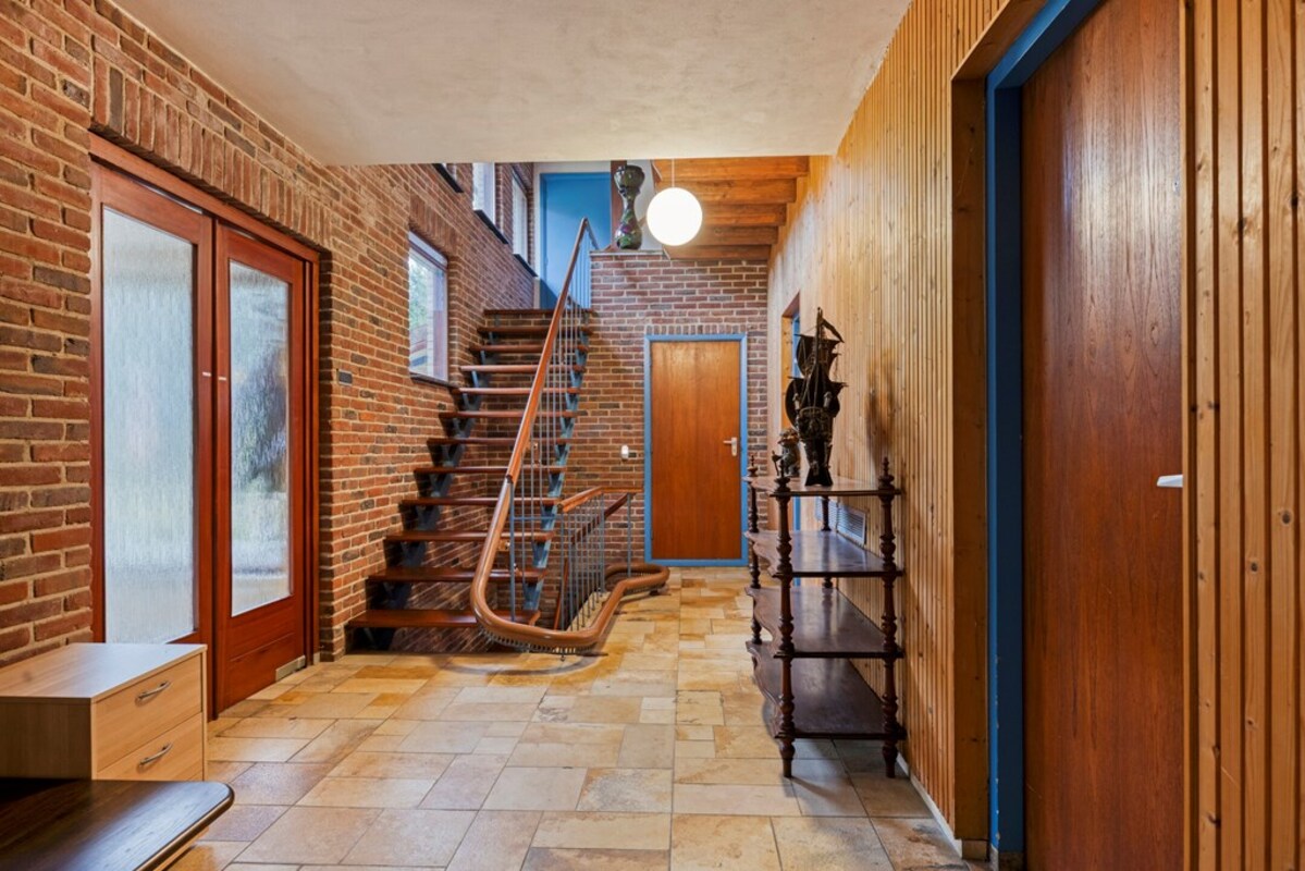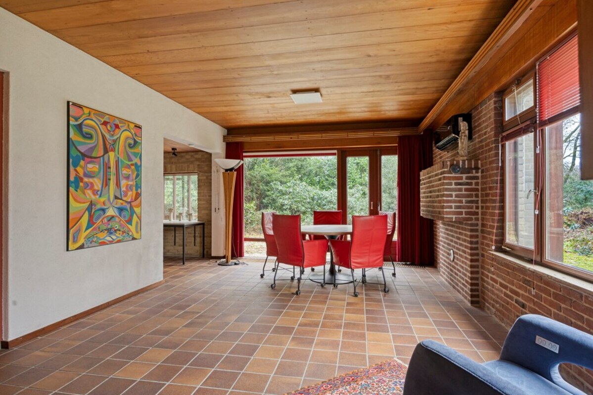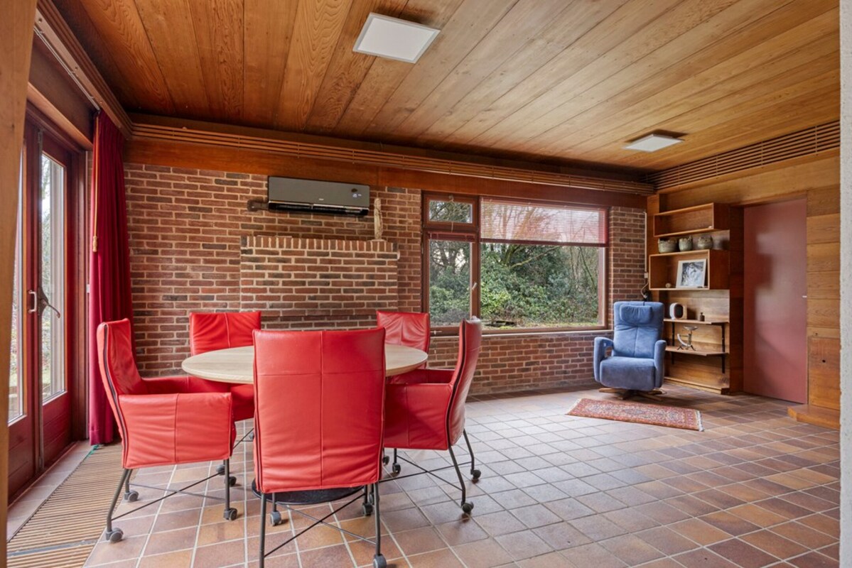 De woonkamer is bijzonder ruim en licht, met een indrukwekkende hoogte en grote raampartijen. De combinatie van hout, natuursteen en schoonmetselwerk geeft deze ruimte een karaktervolle uitstraling. De sfeervolle zitkuil met openhaard vormt het warme hart van de leefruimte en nodigt uit tot ontspanning. Dankzij de open opzet en het lichtinval zijn hier tal van indelingsmogelijkheden denkbaar.