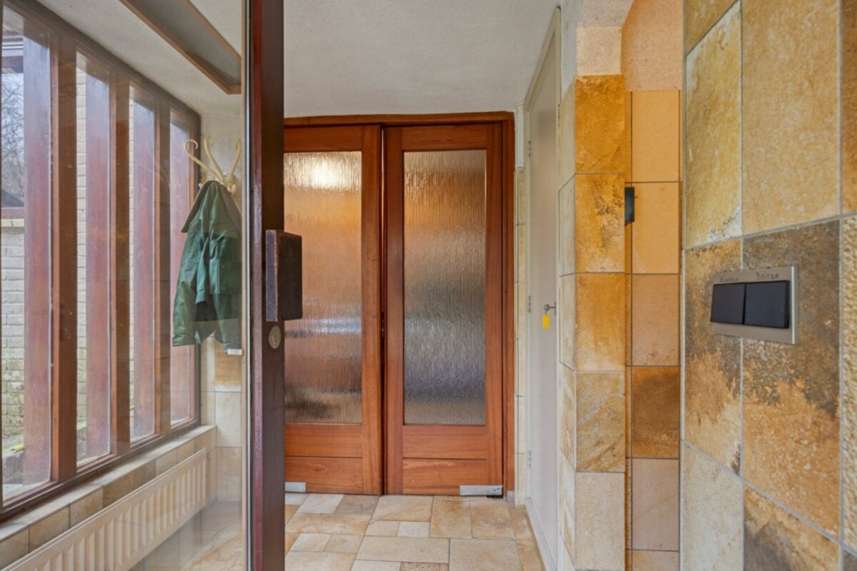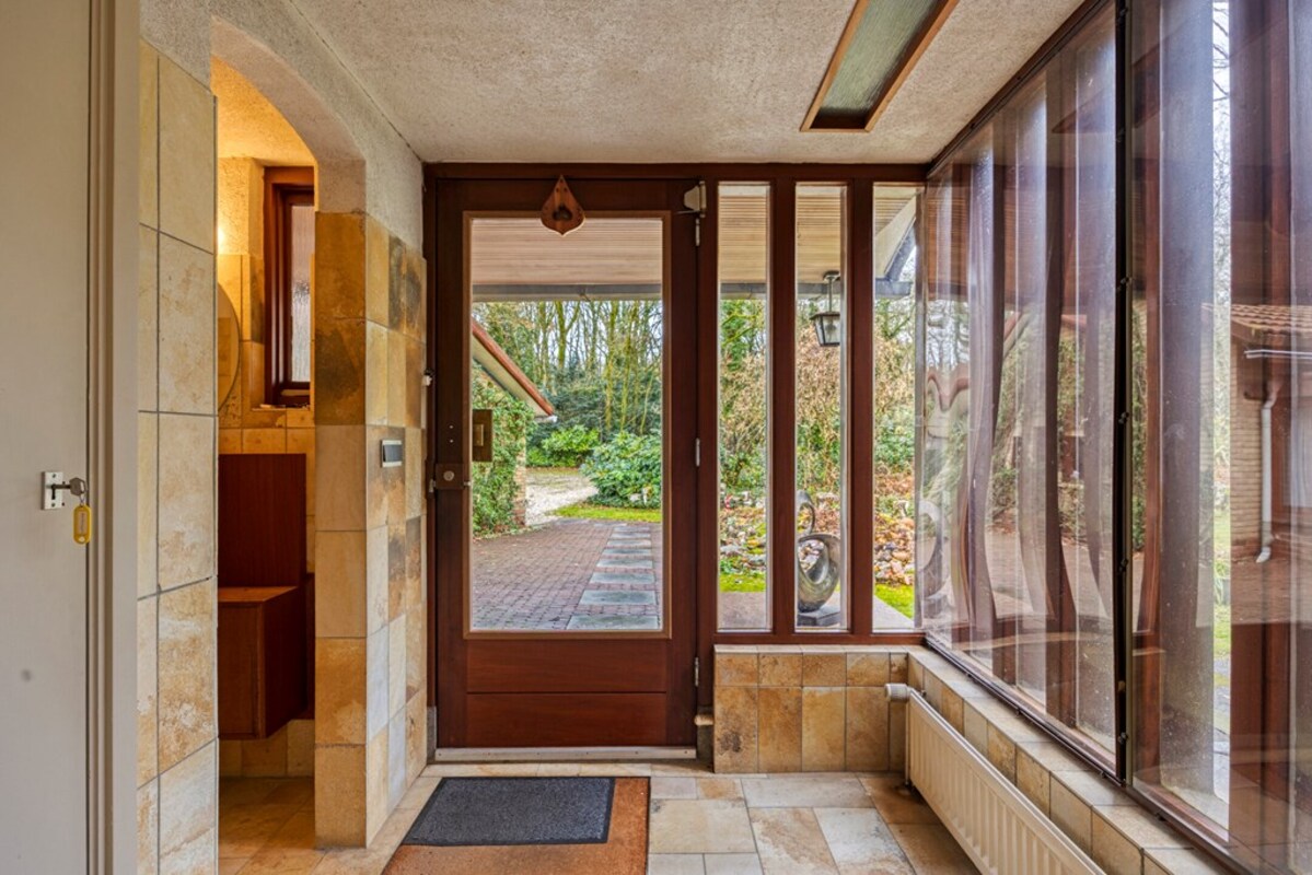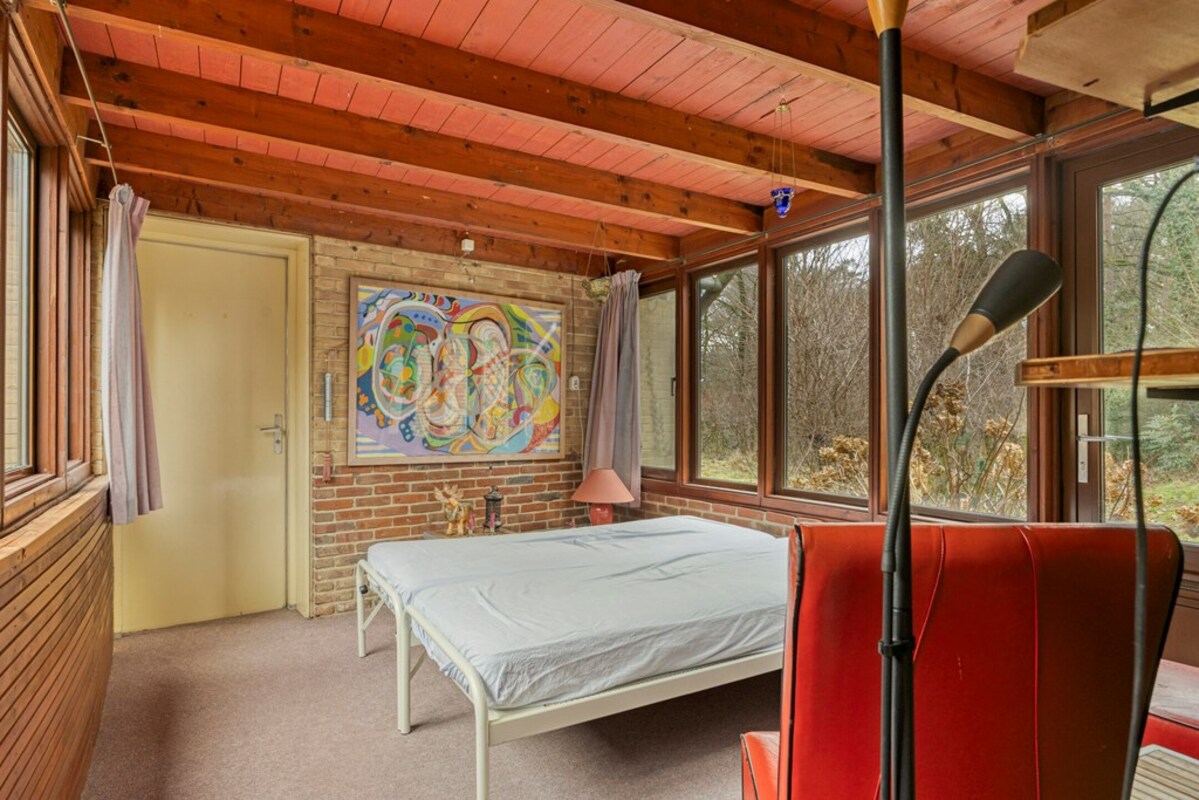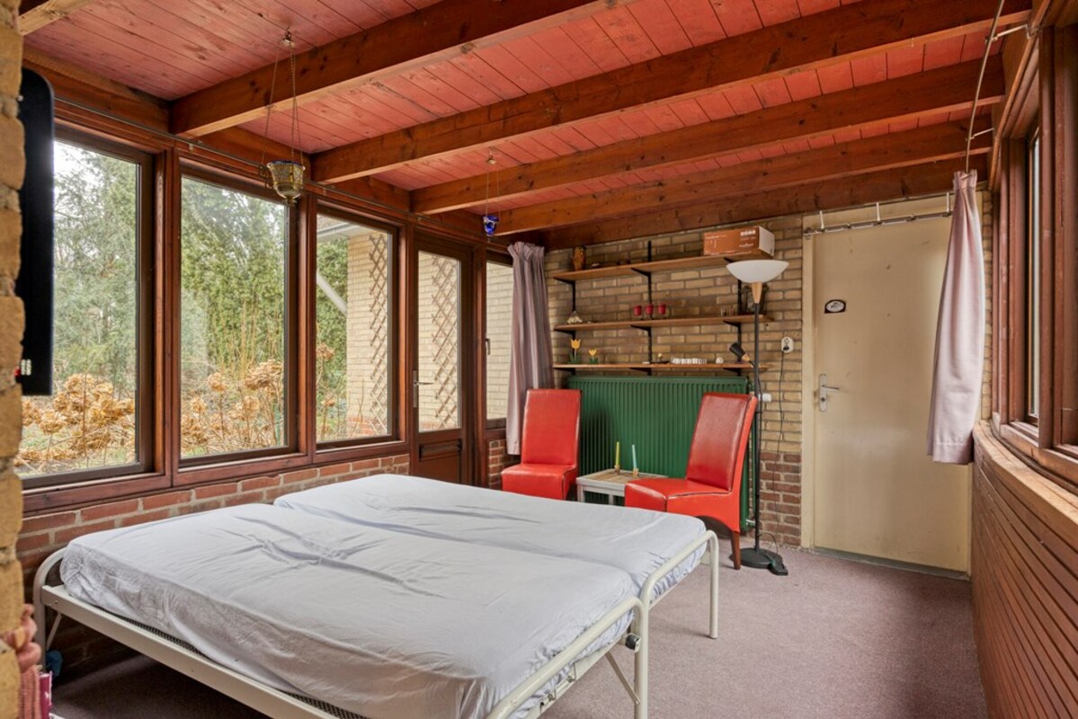 Vanuit de zitkuil is er een doorgang naar een af te sluiten ruimte met veel glas en een toegangsdeur naar de tuin aan de zijkant van de woning. Deze ruimte is nu in gebruik geweest als logeerkamer, maar ontleent zich met al het glas ook zeker als een heerlijke zonnige tuinkamer. Tevens loopt u vanuit deze ruimte zo door naar de dubbele garage.