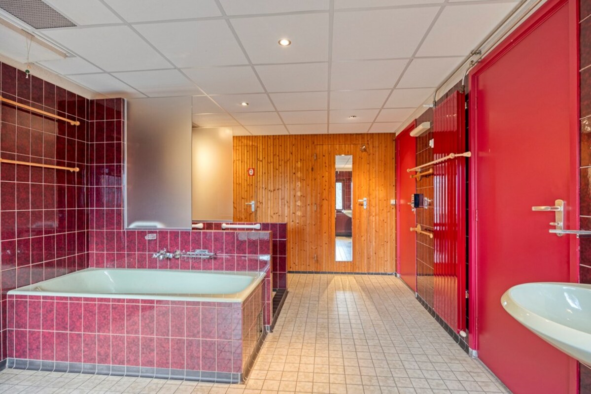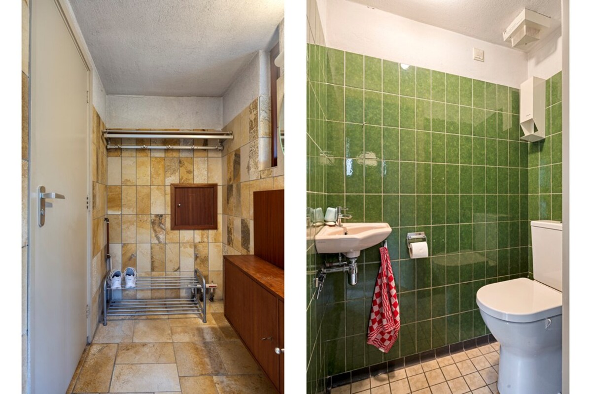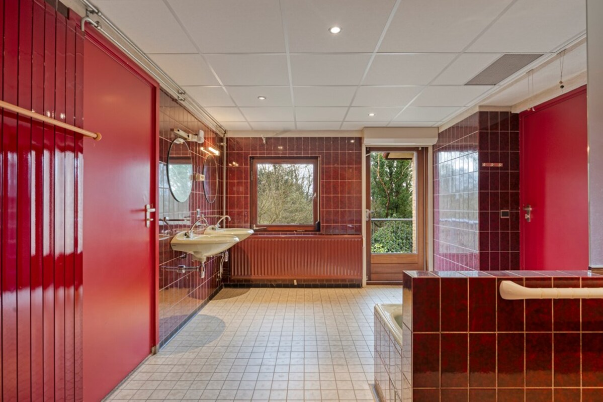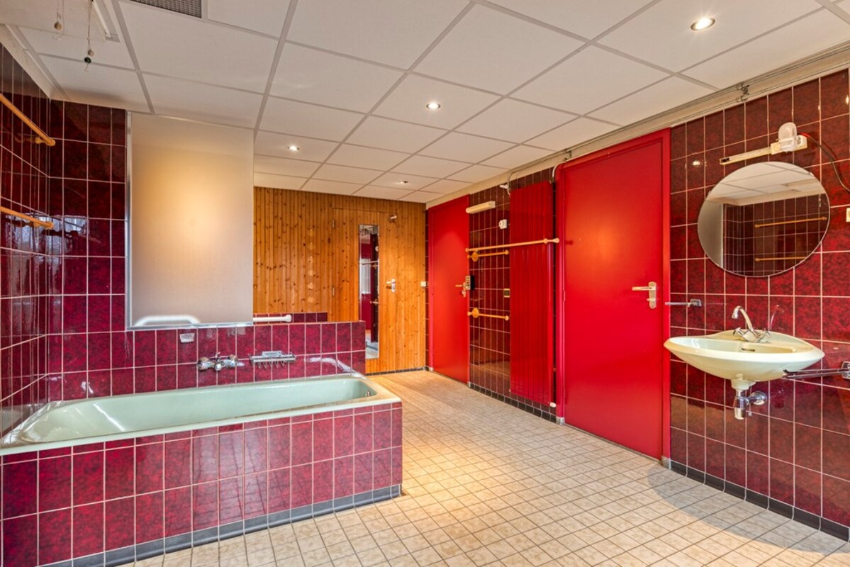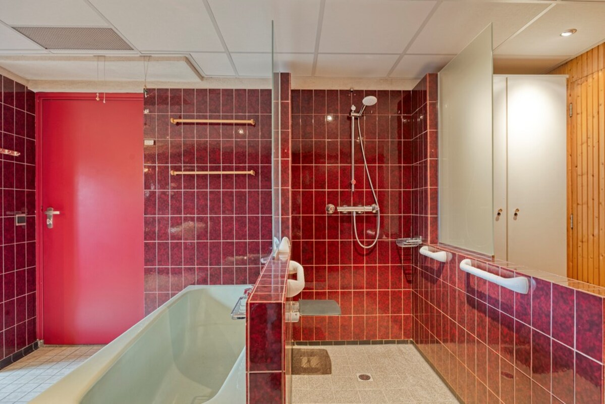 De badkamer is uitgevoerd in een kleurrijke jaren ’70 stijl, maar biedt veel potentie. Er is een apart toiletruimte en zelfs een voorbereiding voor een sauna aanwezig.