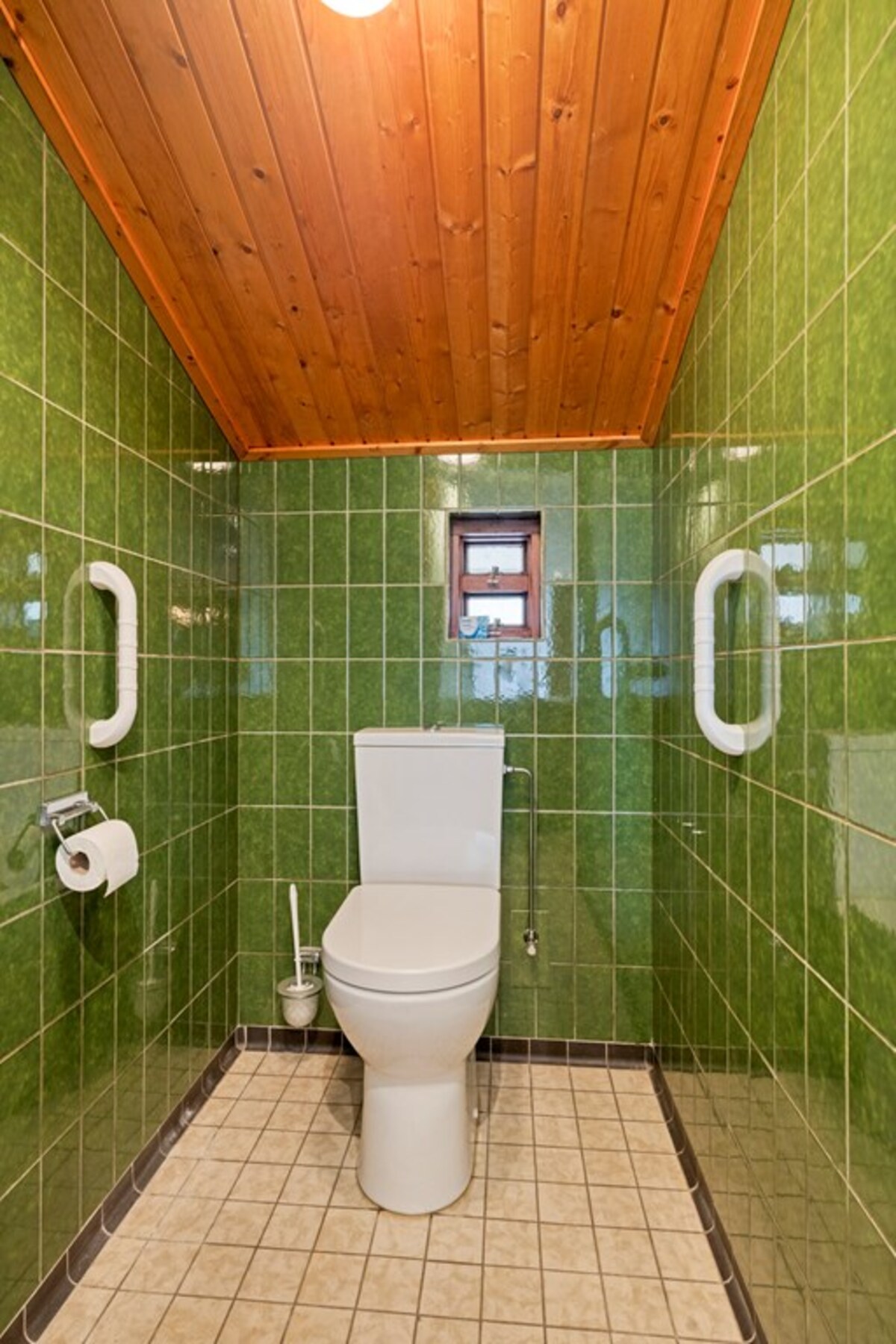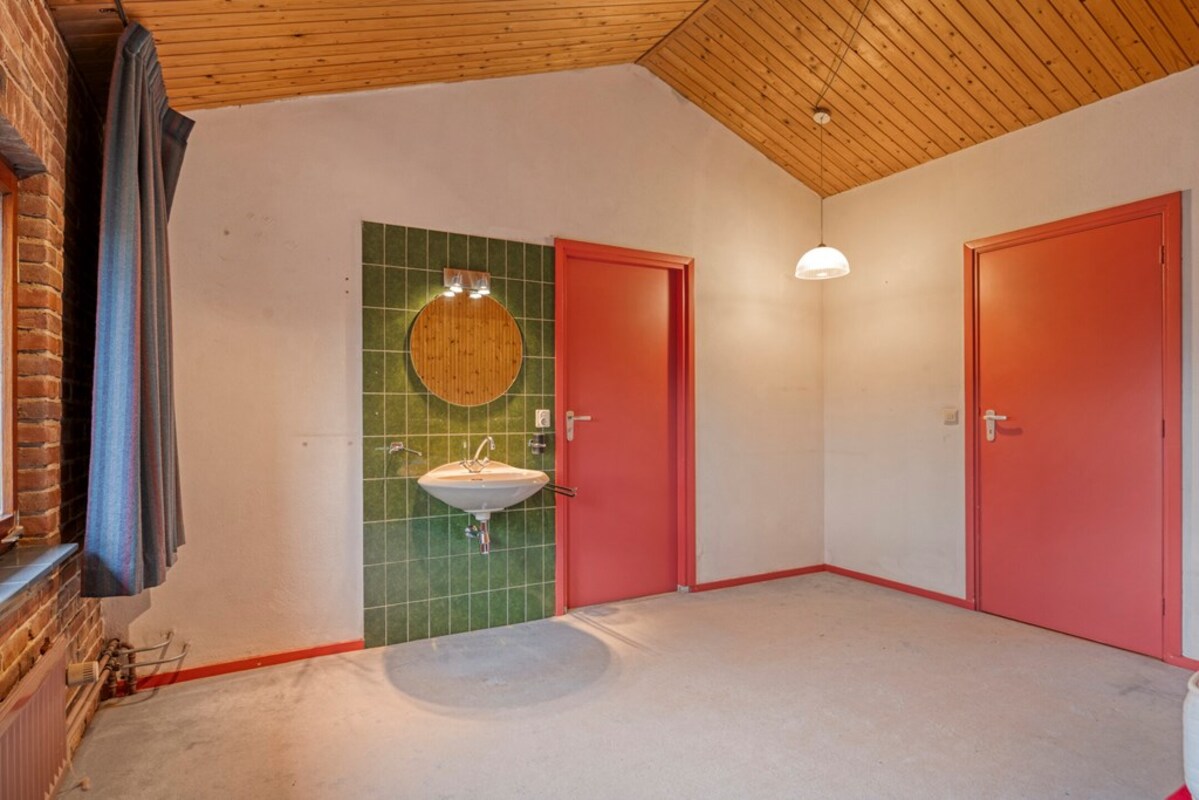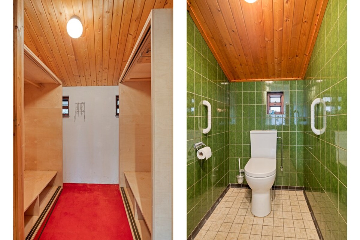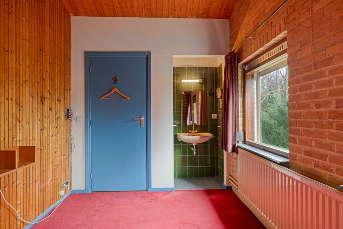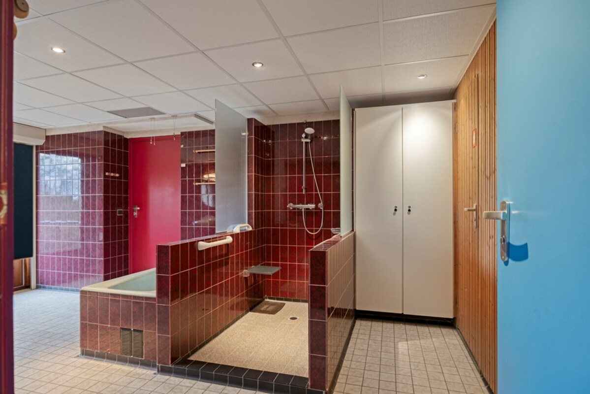 De badkamer is uitgevoerd in een kleurrijke jaren ’70 stijl, maar biedt veel potentie. Er is een apart toiletruimte en zelfs een voorbereiding voor een sauna aanwezig.