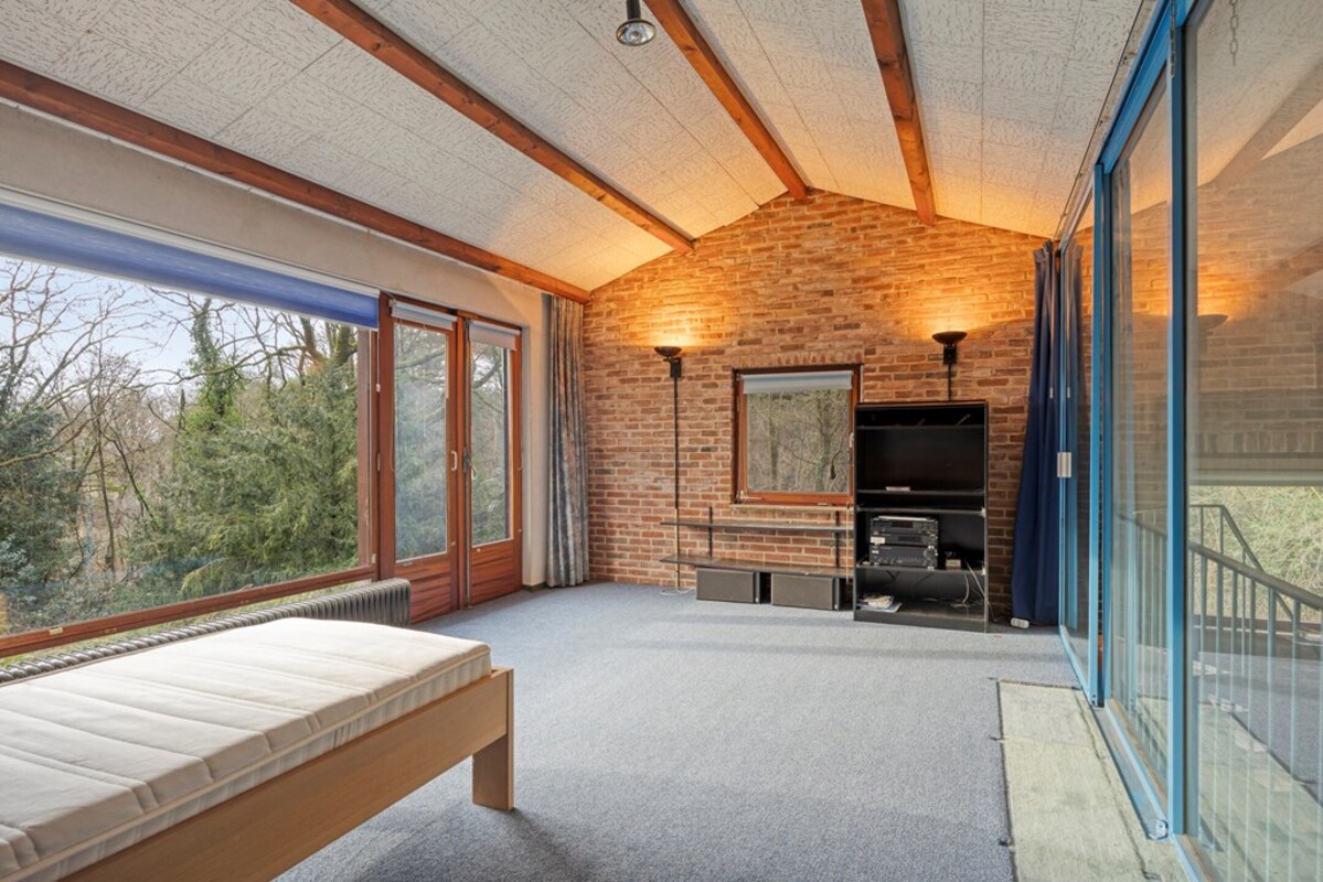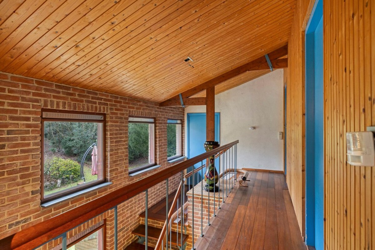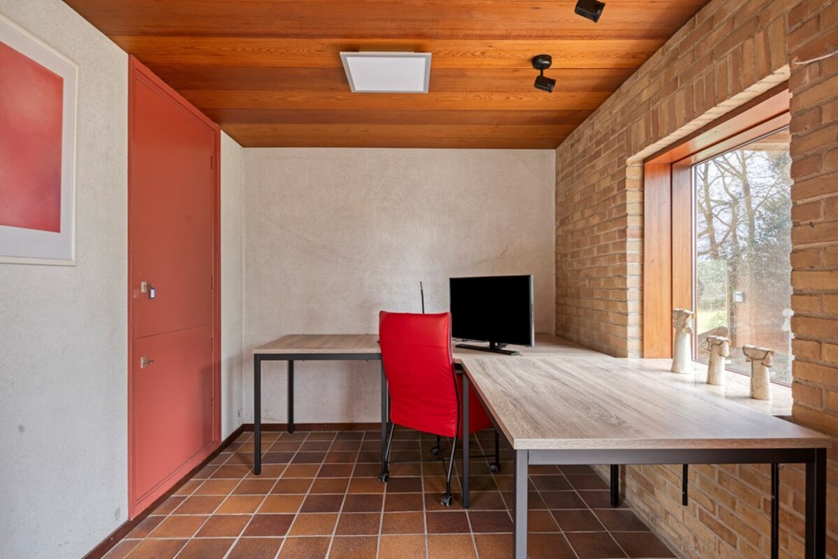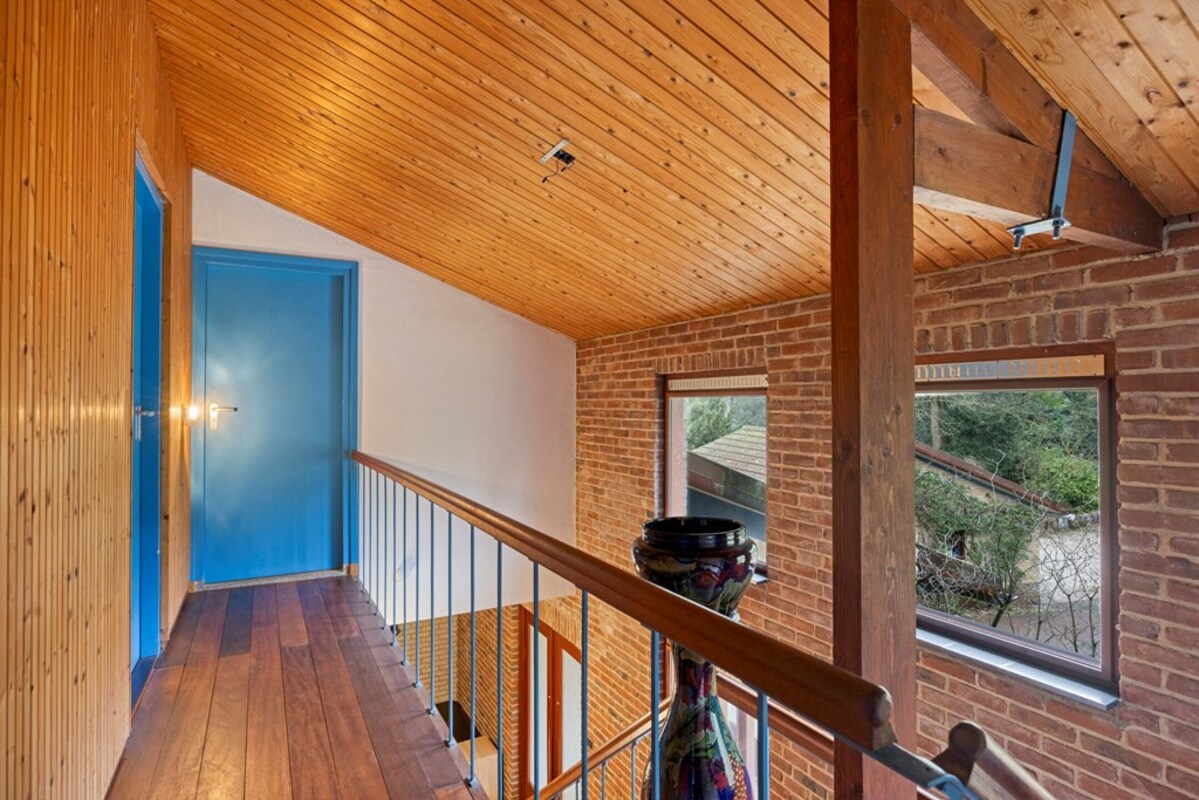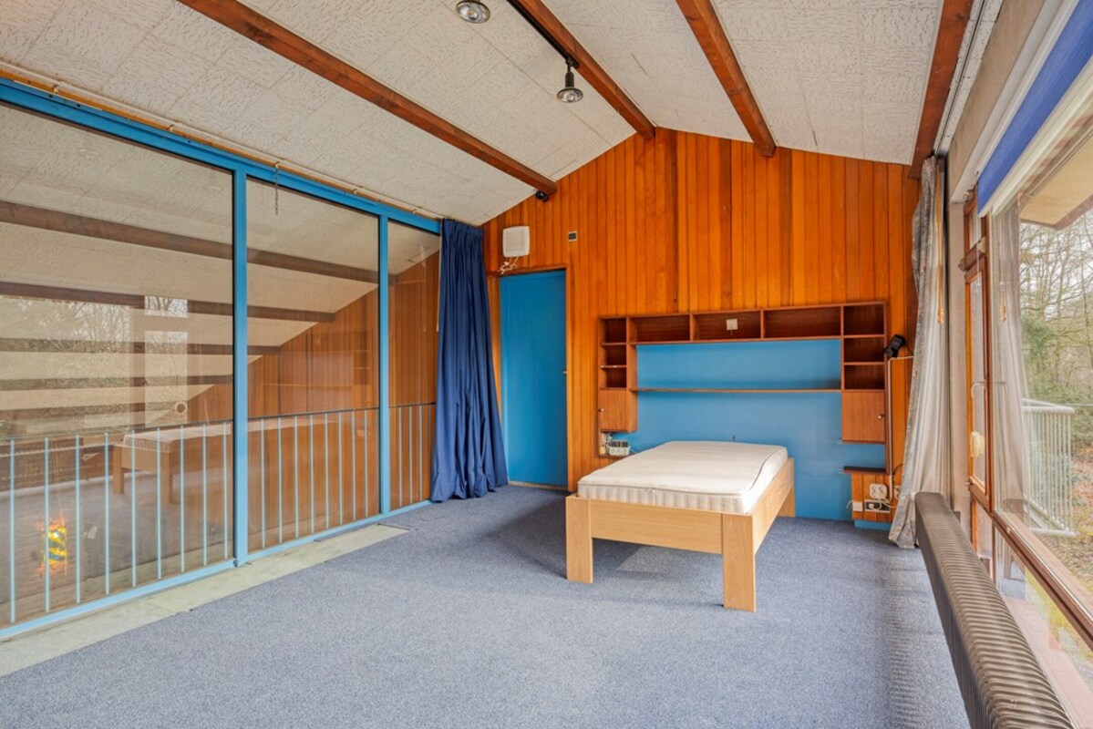 Via een fraaie wenteltrap bereikt u een multifunctionele ruimte op de eerste verdieping, momenteel ingericht als slaapkamer met uitzicht op de woonkamer en het omliggende groen. Deze ruimte leent zich uitstekend als werkplek, extra slaapkamer en hobbyruimte.