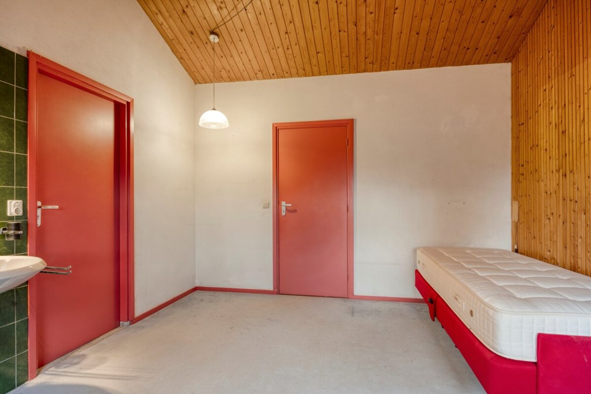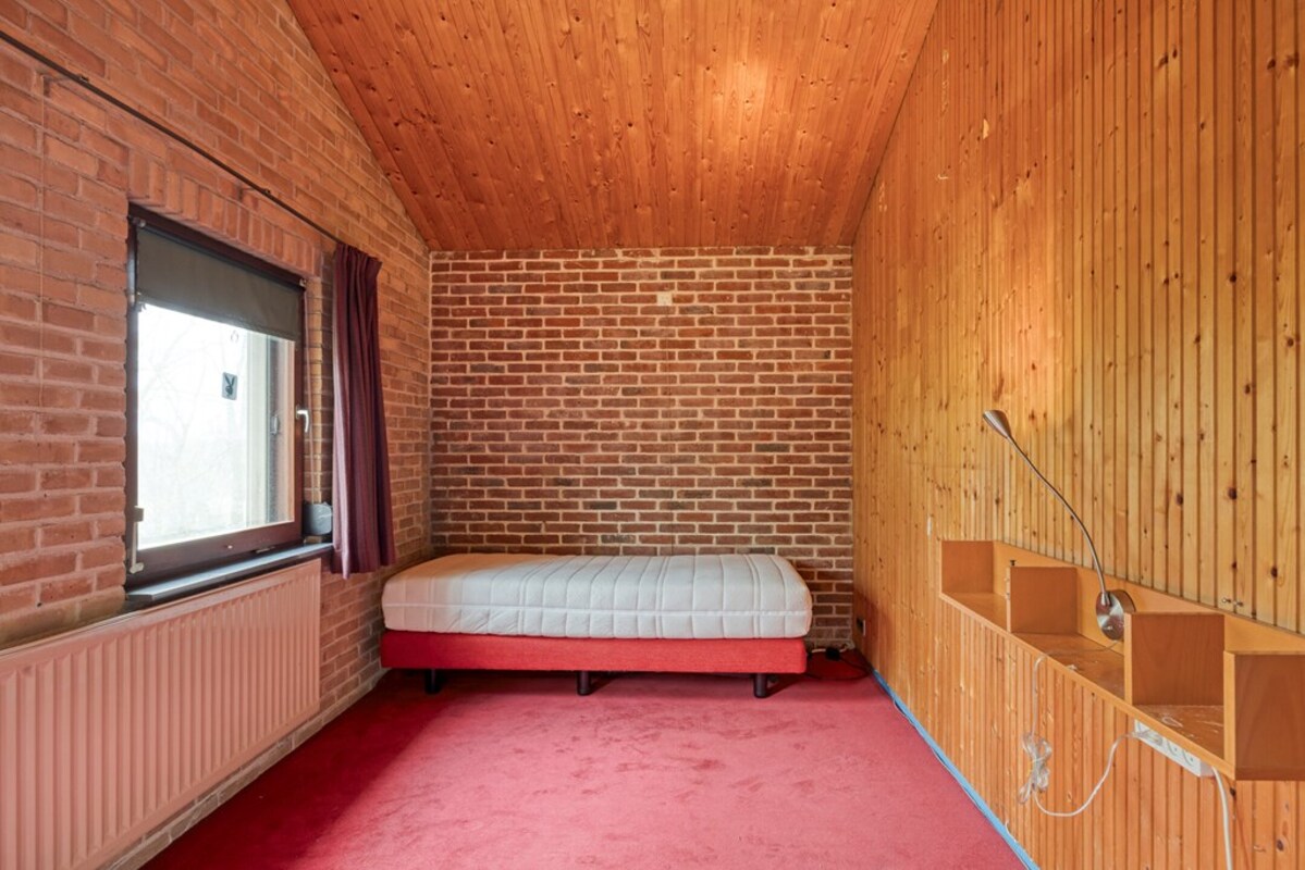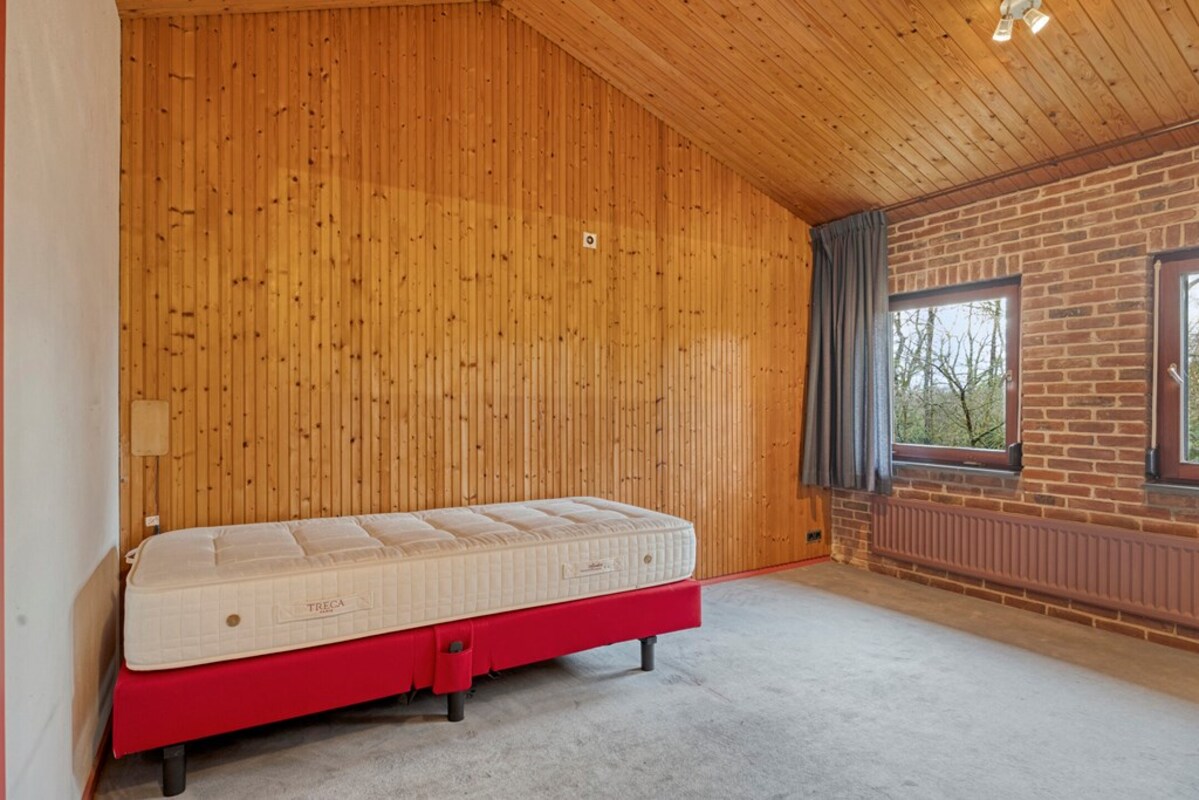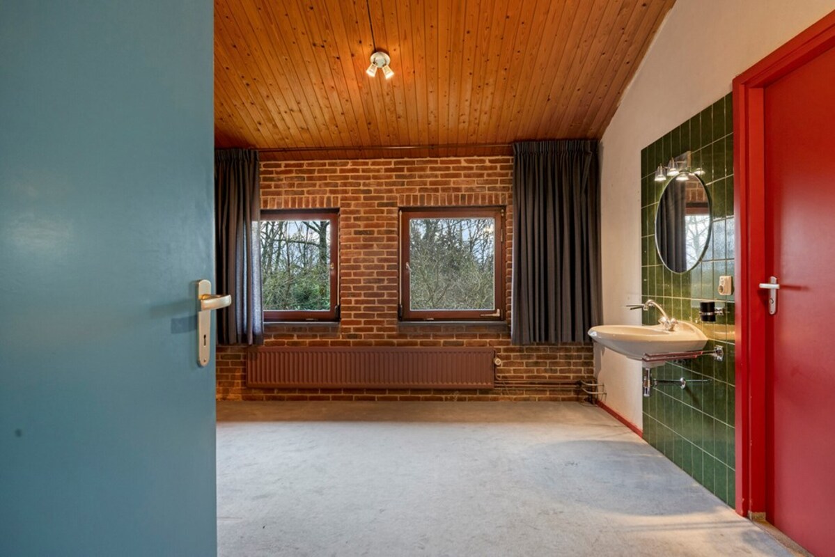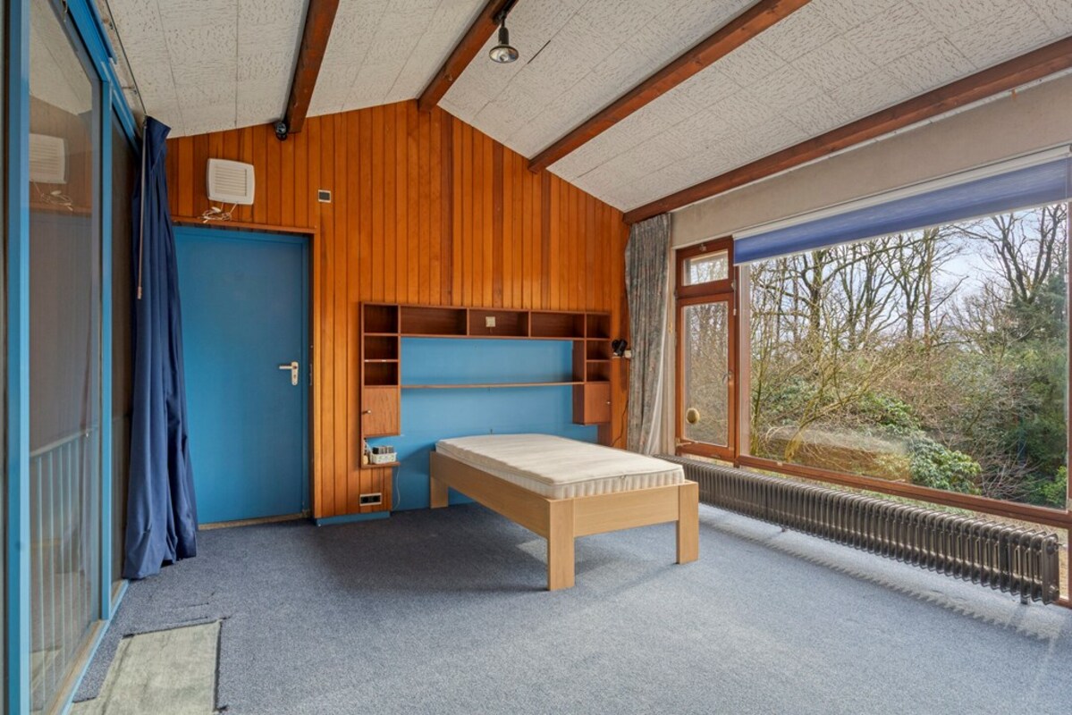 Via een fraaie wenteltrap bereikt u een multifunctionele ruimte op de eerste verdieping, momenteel ingericht als slaapkamer met uitzicht op de woonkamer en het omliggende groen. Deze ruimte leent zich uitstekend als werkplek, extra slaapkamer en hobbyruimte.
