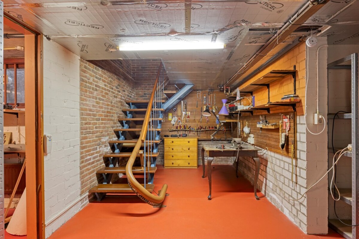 De karakteristieke open trap loopt door naar de kelder. Hier is volop ruimte aanwezig voor een werk-/hobbyruimte. Verder is er een af te sluiten bergruimte en de technische ruimte met c.v.-installatie en aansluiting voor de witgoed apparaten.