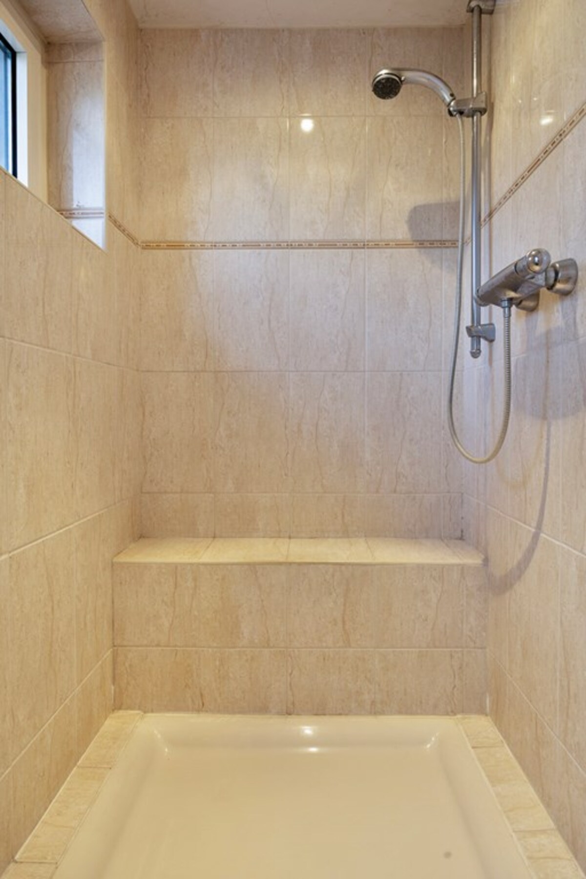 De ruime badkamer in dit deel van de woning is uitgevoerd in neutrale tinten en van alle gemakken voorzien: een dubbele wastafel, toilet en een royale douche.