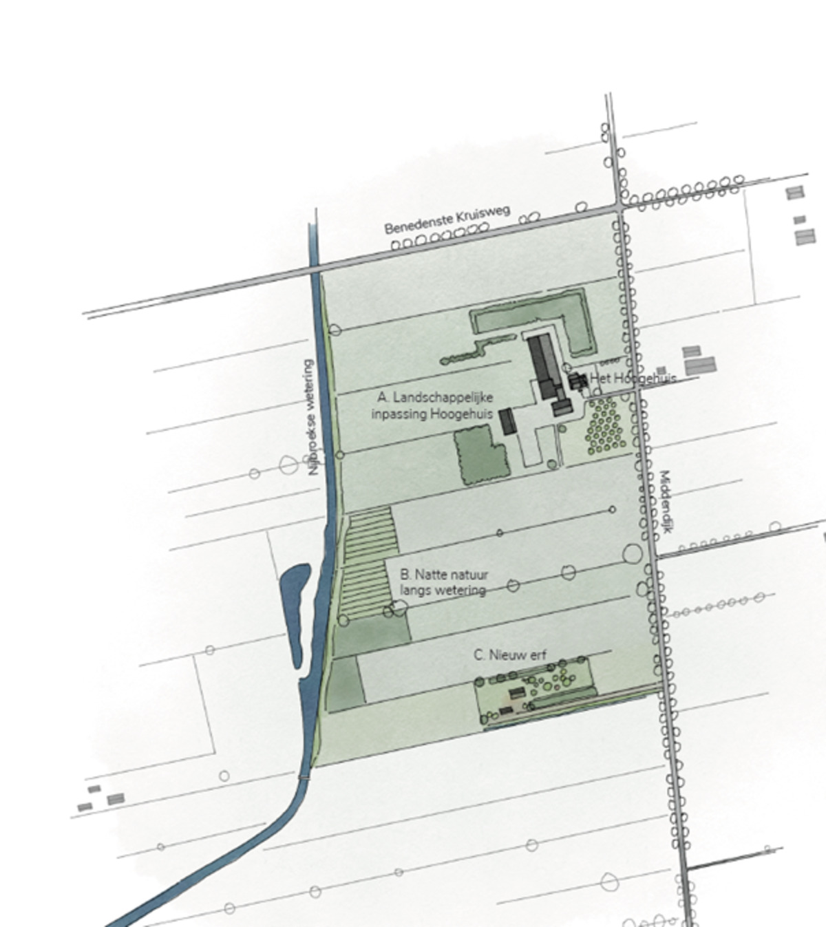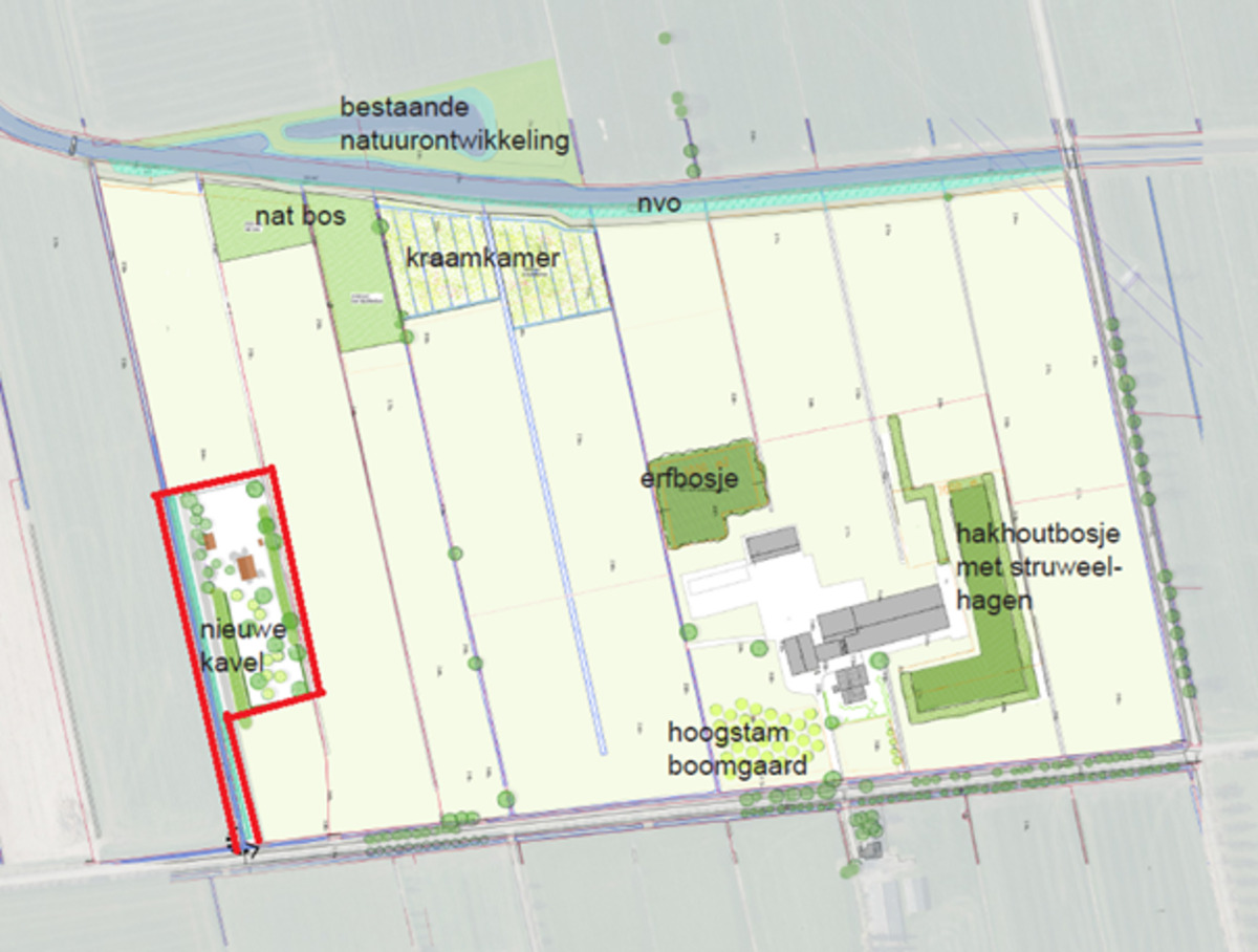 De te koop aangeboden bouwkavel is ontstaan uit een omvangrijk plan waarbij het bestaande agrarische bedrijf een landschappelijke inpassing krijgt in de vorm van hakhoutbosjes en een hoogstamfruitboomgaard, en waarbij langs de Nijbroeker Wetering enkele hectares natuur wordt gerealiseerd.