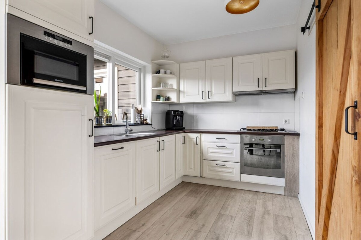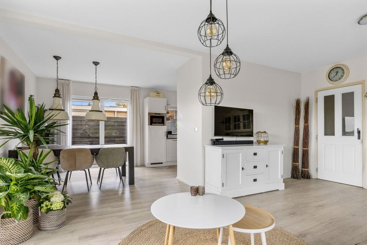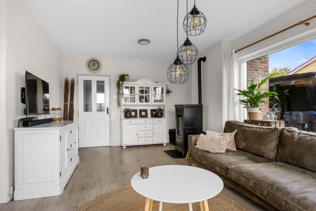 Via de entree kom je in de ruime hal met vernieuwde meterkast (met krachtstroom) en toegang tot de lichte woonkamer. Dankzij de grote raampartijen, windbestendige screens en HR++ beglazing is de woonkamer heerlijk licht en energiezuinig. De vol automatische pelletkachel zorgt voor sfeervolle warmte, maar verwarmen via centrale verwarming of elektrisch behoort ook tot de mogelijkheden. De hoekkeuken is compleet uitgerust met een koelkast, vaatwasser, oven, combimagnetron en een praktische trapkast voor extra bergruimte. Vanuit de keuken stap je via de schuifpui direct het terras op – Hier kun je heerlijk beschut zitten. Ideaal voor zomerse dagen.