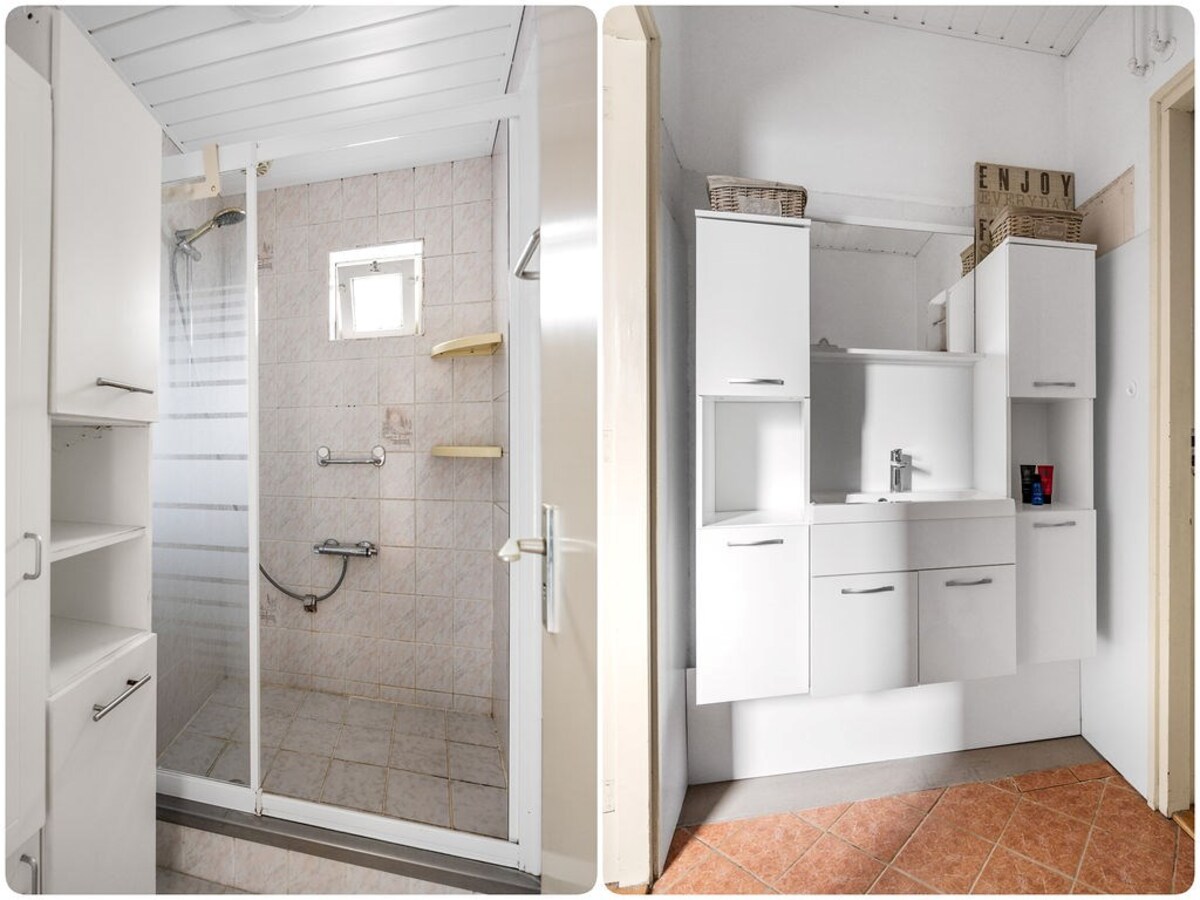Op de begane grond bevindt zich ook de badkamer, voorzien van een douche, toilet en wastafelmeubel. Aansluitend is er een tussenhal met toegang tot twee slaapkamers.