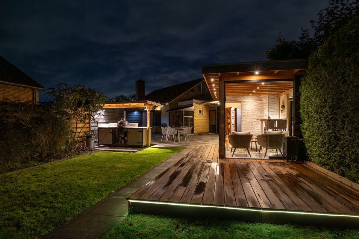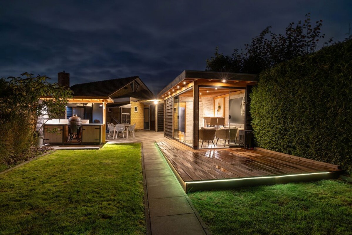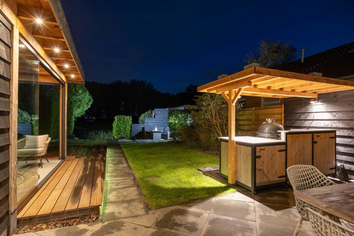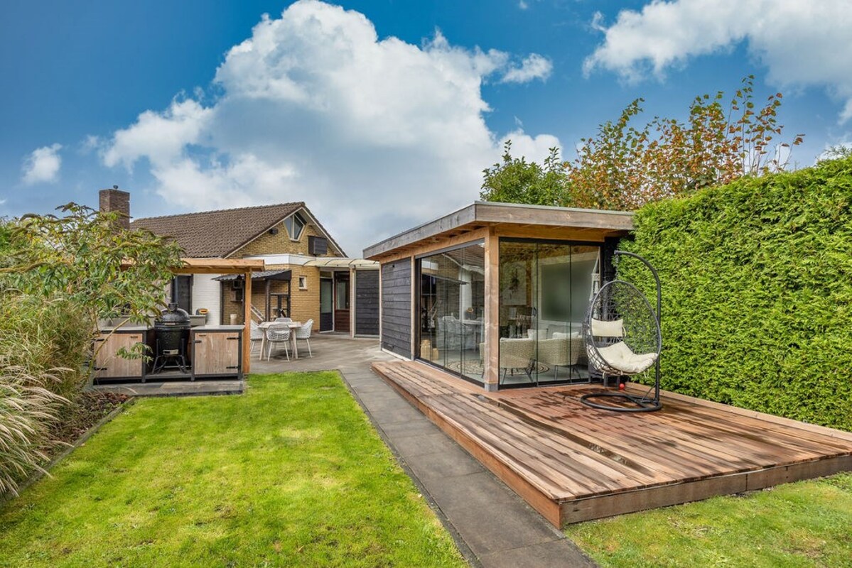 De achtertuin is een waar buitenparadijs met o.a.- De absolute blikvanger is de luxe tuinkamer met geïsoleerde wanden, 2 glazen schuifwanden, keukenblok met boiler (warm water) en verlichting met sensor. - Een buitenkeuken (ter overname) met koelkast, granieten aanrechtblad en windbreekgaas is perfect voor buiten koken met uitzicht over het weiland.- De vlonder is gefundeerd op 49 palen, waardoor zelfs een jacuzzi met gemak geplaatst kan worden. Een ideale plek om het hele jaar door van te genieten!- Een ruime verwarmde klusruimte d.m.v. 2 radiatoren- En een verrassende geisoleerde mancave achterin, compleet met verwarming, bar, wateraansluiting, sanibroyeur toilet, en smartspots.- Een fietsenhok met verlichting en schuifdeur biedt praktische bergruimte.- Achterin de tuin vind je een vlonder aan het water (met veel vis, dus prima plek om te vissen) met stroom- en internetaansluiting en een vishengelberging.- Meerdere zitjes en volop privacy.