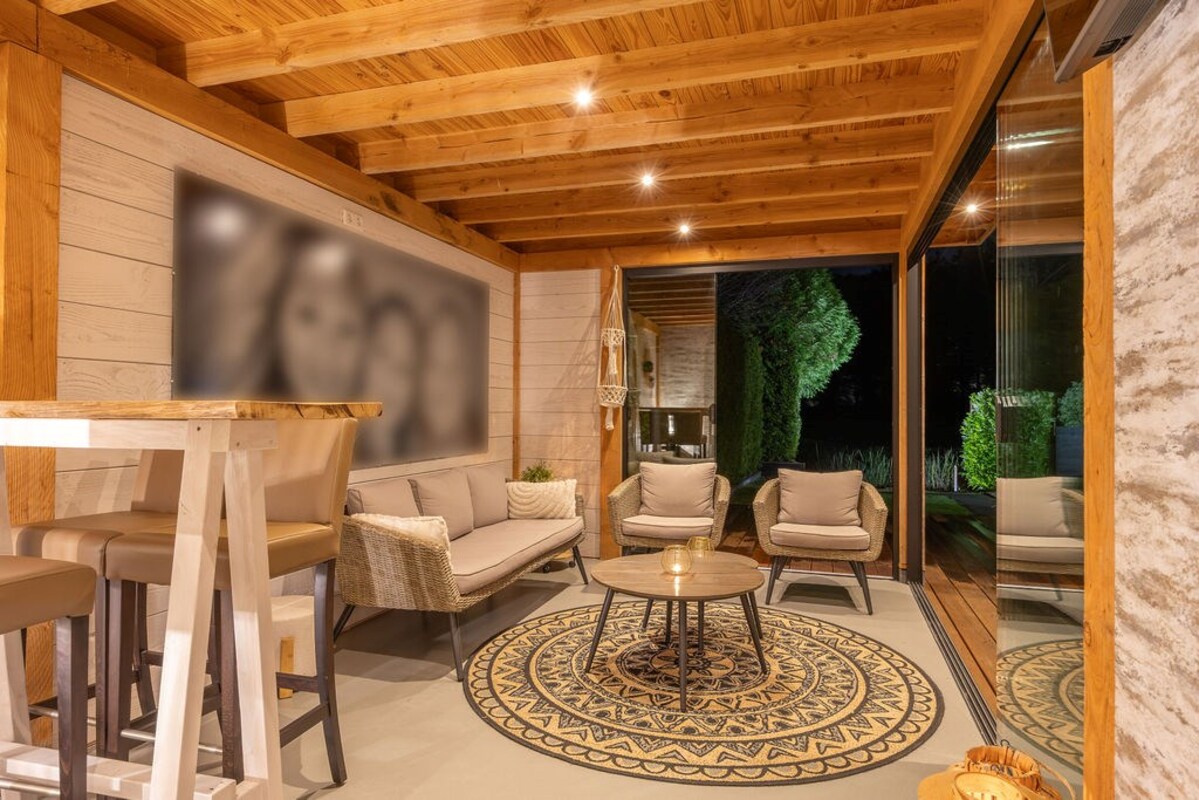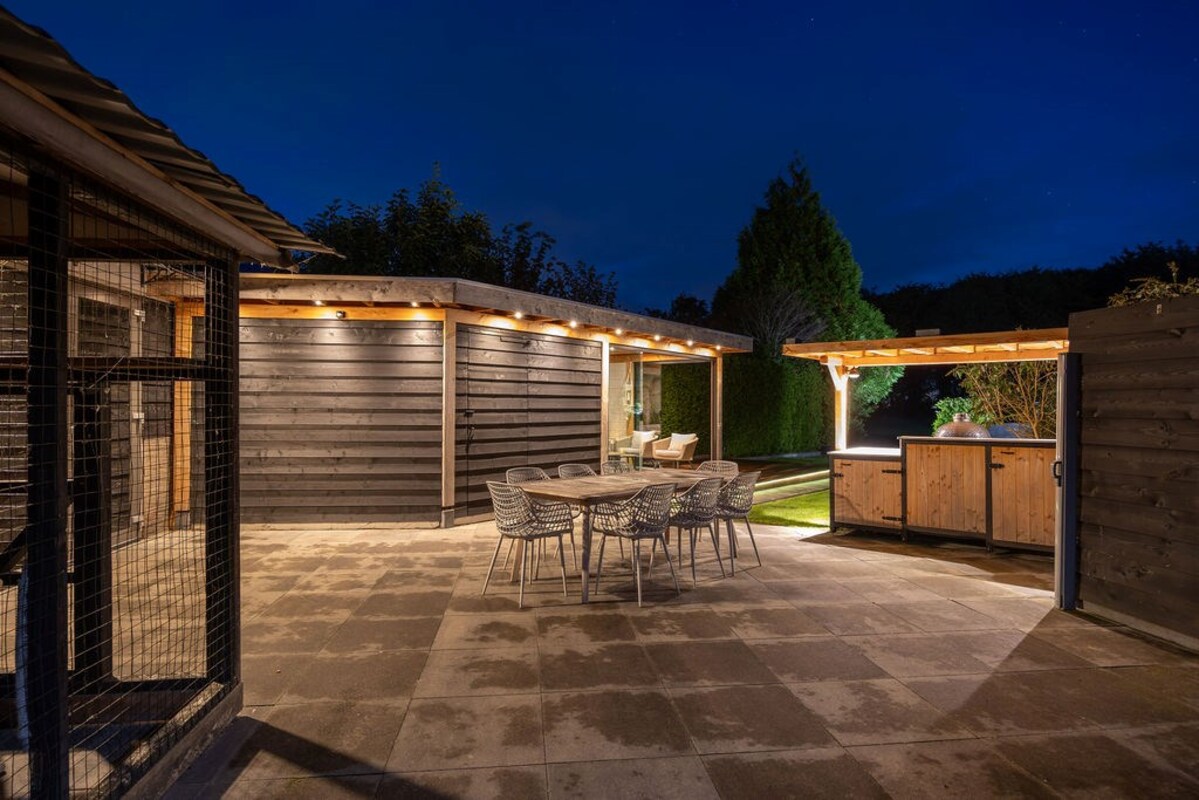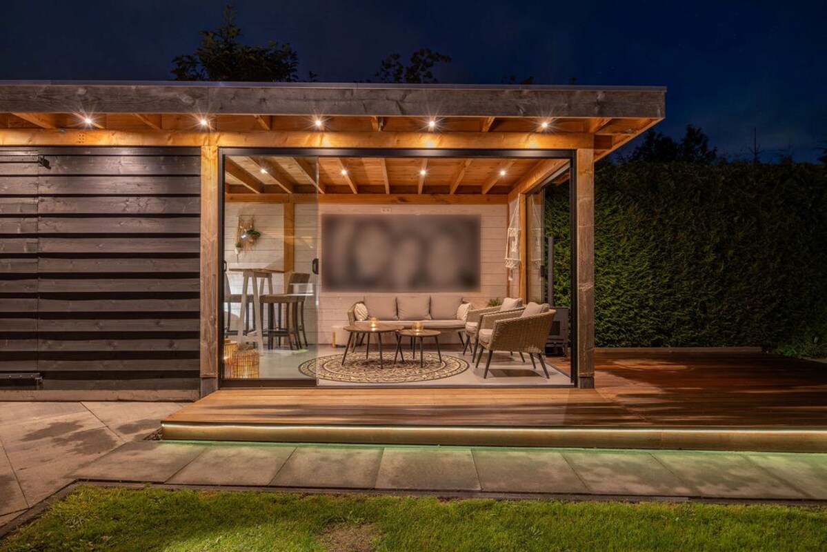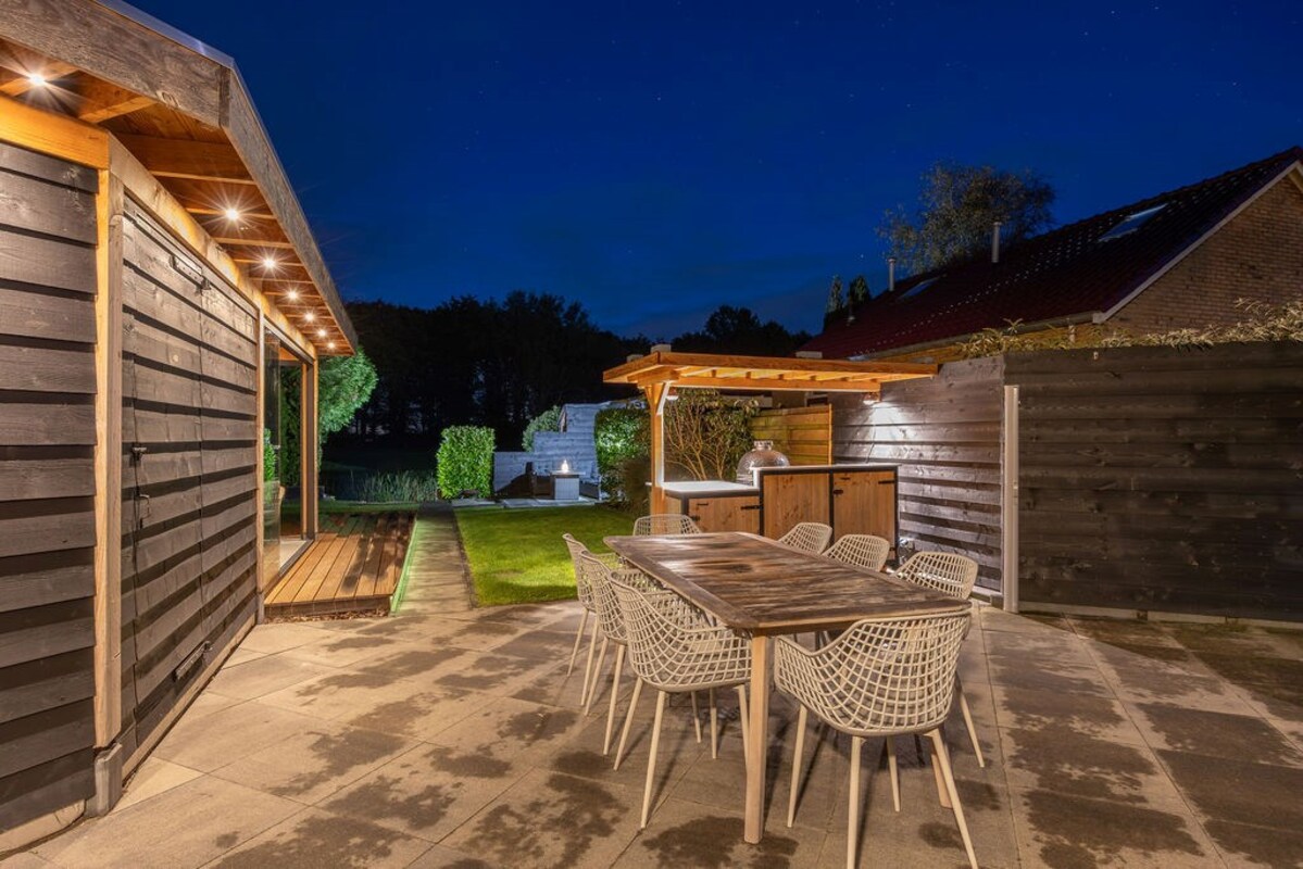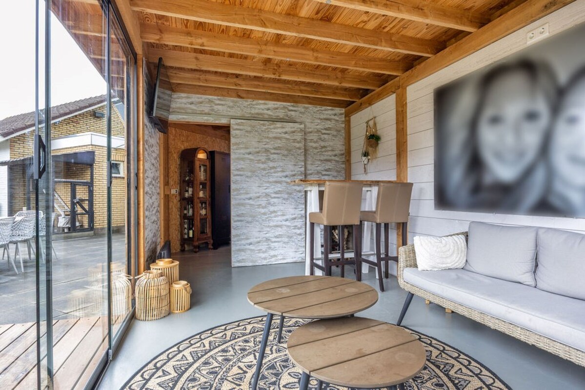 De achtertuin is een waar buitenparadijs met o.a.- De absolute blikvanger is de luxe tuinkamer met geïsoleerde wanden, 2 glazen schuifwanden, keukenblok met boiler (warm water) en verlichting met sensor. - Een buitenkeuken (ter overname) met koelkast, granieten aanrechtblad en windbreekgaas is perfect voor buiten koken met uitzicht over het weiland.- De vlonder is gefundeerd op 49 palen, waardoor zelfs een jacuzzi met gemak geplaatst kan worden. Een ideale plek om het hele jaar door van te genieten!- Een ruime verwarmde klusruimte d.m.v. 2 radiatoren- En een verrassende geisoleerde mancave achterin, compleet met verwarming, bar, wateraansluiting, sanibroyeur toilet, en smartspots.- Een fietsenhok met verlichting en schuifdeur biedt praktische bergruimte.- Achterin de tuin vind je een vlonder aan het water (met veel vis, dus prima plek om te vissen) met stroom- en internetaansluiting en een vishengelberging.- Meerdere zitjes en volop privacy.