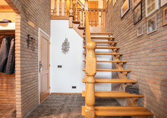 U betreedt de woning via de ruime hal met vide. In de hal is een toilet met fonteintje, een garderobenis, kastruimte, de meterkast en een fraaie eiken trapopgang naar de eerste verdieping. Via de hal komt u in de ruime woonkamer met openslaande deuren naar het terras, fraaie eikenhouten vloer, balkenplafond en schouw met houtkachel. Door de raampartijen kunt u optimaal genieten van de tuin en veel lichtinval. En met koude dagen heerlijk opwarmen bij de kachel. Het eetgedeelte heeft een open verbinding met de woonkeuken. De woonkeuken heeft een tegelvloer en een landelijke keukenopstelling met vaatwasser, combi oven, stoomoven, inductiekookplaat, afzuigkap en koelkast. Daarnaast is er nog een magnetron aanwezig. Vanuit de woonkeuken komt u in de achterbouw. Deze achterbouw met wasbak biedt toegang tot het souterrain/de kelder en de ruime garage en middels de achterdeur komt u in de tuin. De ruime garage (ca. 23 m²) heeft openslaande dubbele deuren, een centrale stofzuiginstallatie en een toegangsdeur naar de achterliggende berging. Deze berging heeft eveneens een deur naar de tuin.