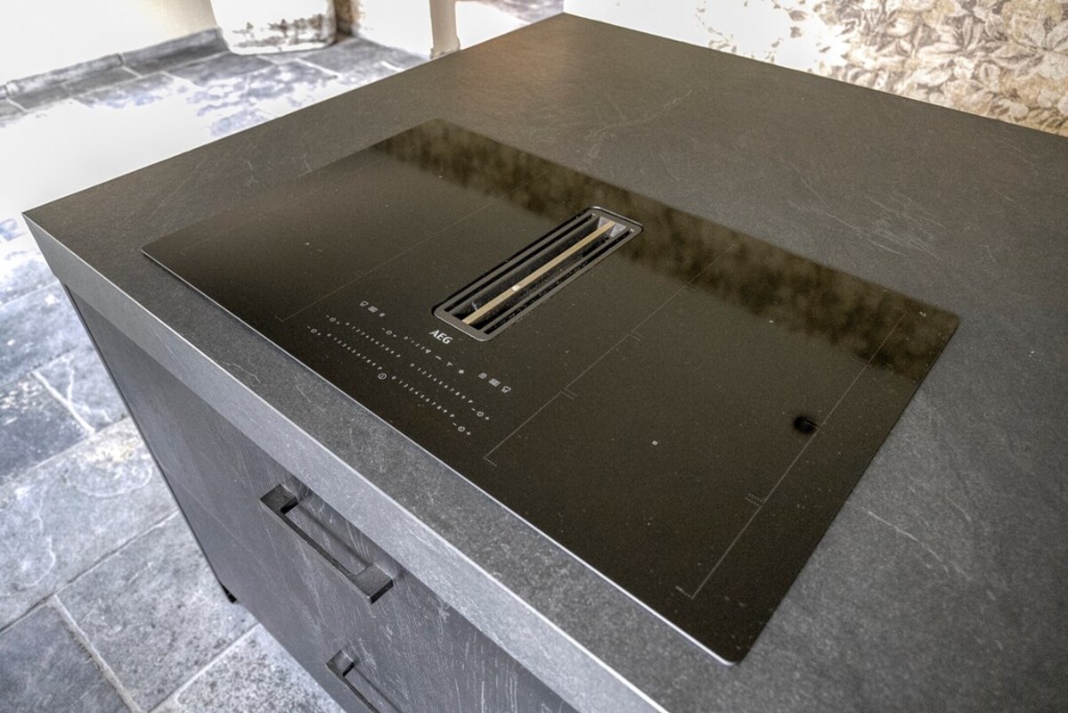 De keuken in het hoofdgebouw is luxe uitgevoerd en van alle gemakken voorzien. Zo is deze uitgerust met een elektrische kookplaat, een oven, een ruime koelkast met vriezer, een luxe vaatwasser én een ingebouwde wijnkoeler. Vanuit de keuken heb je bovendien een prachtig, weids uitzicht over de omliggende landerijen – een perfecte plek om te koken, te genieten en te ontvangen.