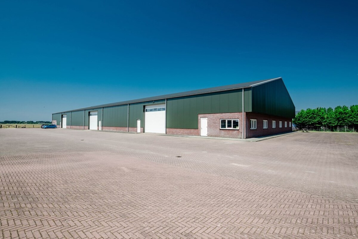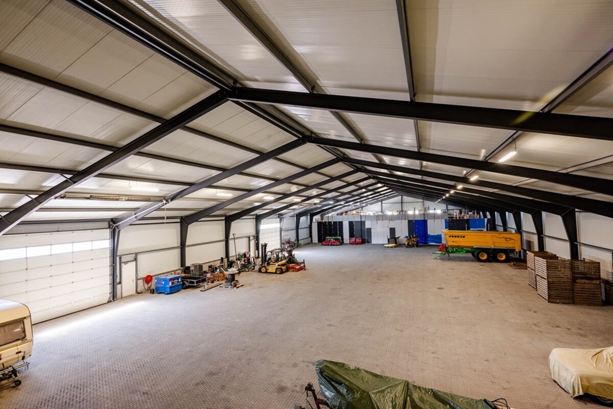 Het grootste gedeelte van de loods is ingericht als akkerbouwloods. Dit gedeelte heeft een lente van 66,95 meter met een breedte van 30,34 meter. De totale oppervlakte is ongeveer 2.031 m². Er bevinden zich 2 elektrische overheaddeuren van 5,74 meter bij 5 meter en 2 loopdeuren. Er ligt geen vaste vloer in dit gedeelte van de loods. Dit is gedaan voor de mogelijke bouw van een rijhal in de loods in de toekomst. Boven de werkplaats bevindt zich een verdieping, die te bereiken is met een vaste trap, die ingericht kan worden als kantine en juryplek voor mogelijke paardrijwedstrijden. De volgende ruimte is ingericht als opslagruimte. Deze is afgesloten met een tijdelijke wand en heeft een lengte van 30,40 meter met een breedte van 30,34 meter. De totale oppervlakte van dit gedeelte is ongeveer 922 m². De opslagruimte is voorzien van een overheaddeur van 5,74 meter bij 5 meter.