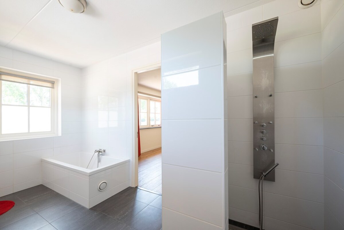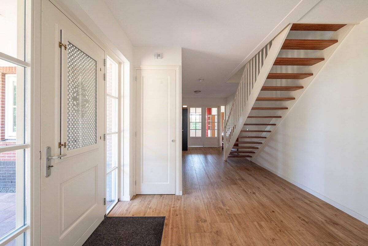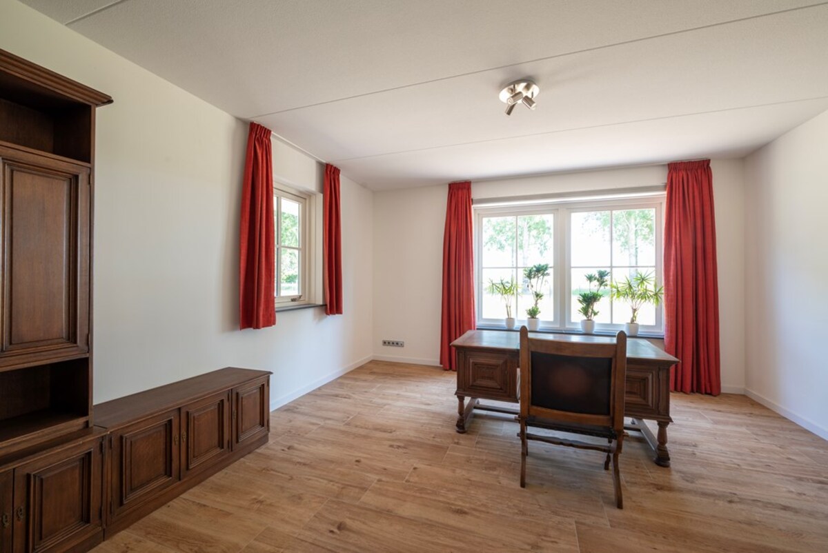 Deze riante woning is in 2012 gebouwd. De gevels zijn van steen met spouw, schilddak met pannen gedekt. De vloer is van beton. De indeling is als volgt: begane grond: entree, trapopgang, kantoor, wasruimte, cv-ruimte, woonkamer, woonkeuken met ingebouwde oven, magnetron, koelkast, vriezer en vaatwasser. In de woonkeuken bevindt zich een erker, vanuit waar je een prachtig uitzicht hebt over het landschap achter de woning. Verder is er op de begane grond een ouderslaapkamer met een eigen badkamer met inloop douche en ligbad, een grote bijkeuken met wc en achterdeur naar de inpandige garage met roldeur.
