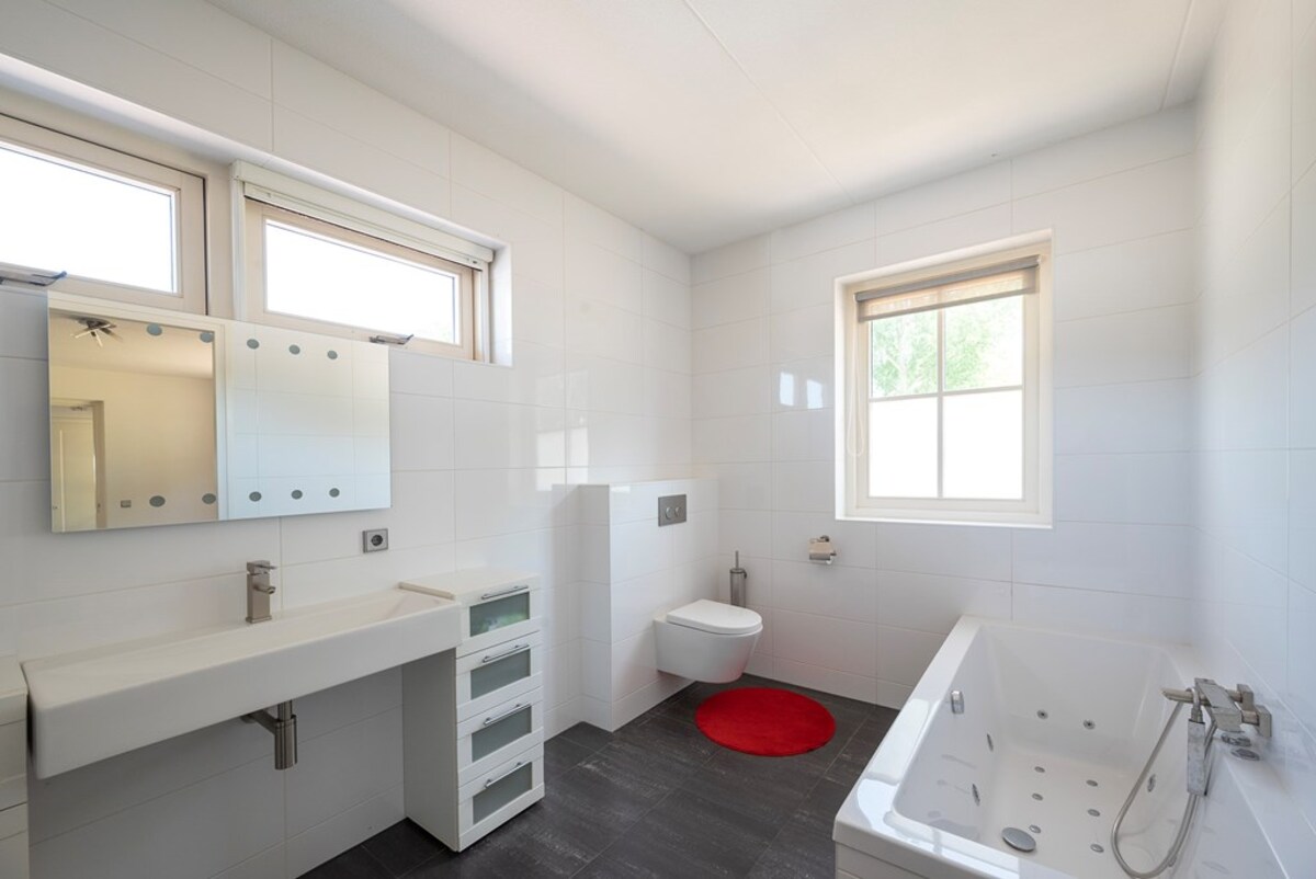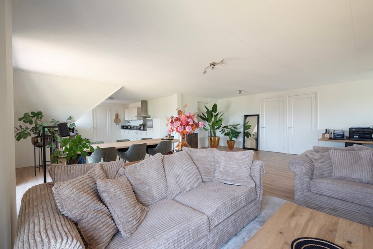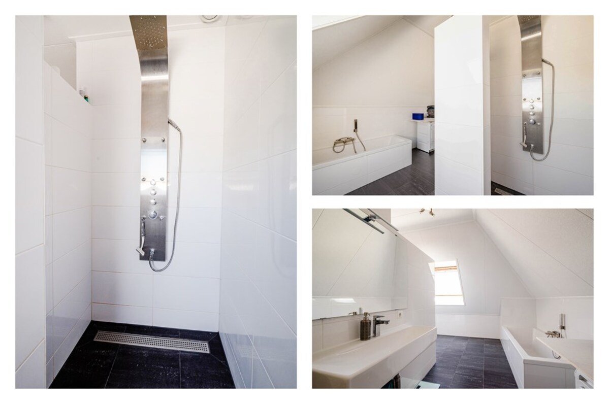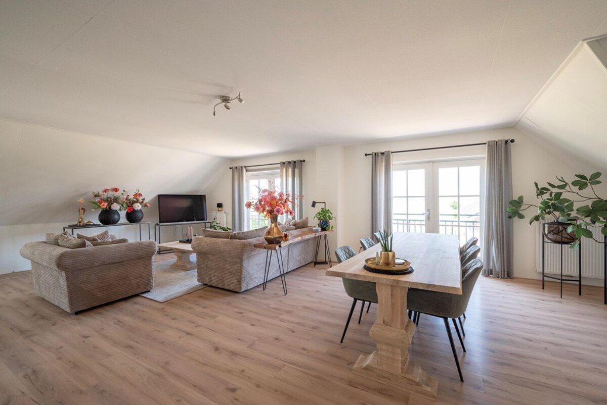 De riante verdieping is als volgt ingericht: overloop, twee riante slaapkamers en grote badkamer met inloopdouche, ligbad en tevens voorzien van vloerverwarming, zitkamer met 2 Franse balkons en open woonkeuken met ingebouwde combi magnetron, koelkast en vaatwasser. De ruime zolder, is bereikbaar door middel van een vlizotrap in één van de twee slaapkamers. De zoldervloer is geïsoleerd. Ideaal als gastenverblijf of voor inwonend personeel.