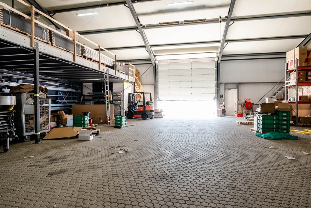 De werkplaats is voorzien van 2 grote schuifdeuren die leiden naar de overige ruimte in de loods en sanitaire voorziening. Er zijn voorzieningen getroffen voor de aanleg van vloerverwarming.