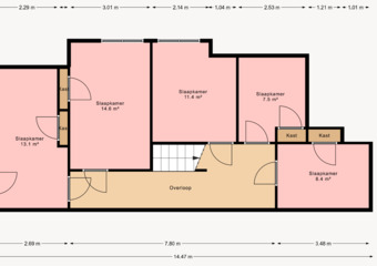 Slaapkamers: De slaapkamers hebben een oppervlakte van circa 7m2, 8m2, 11m2, 13m2 en